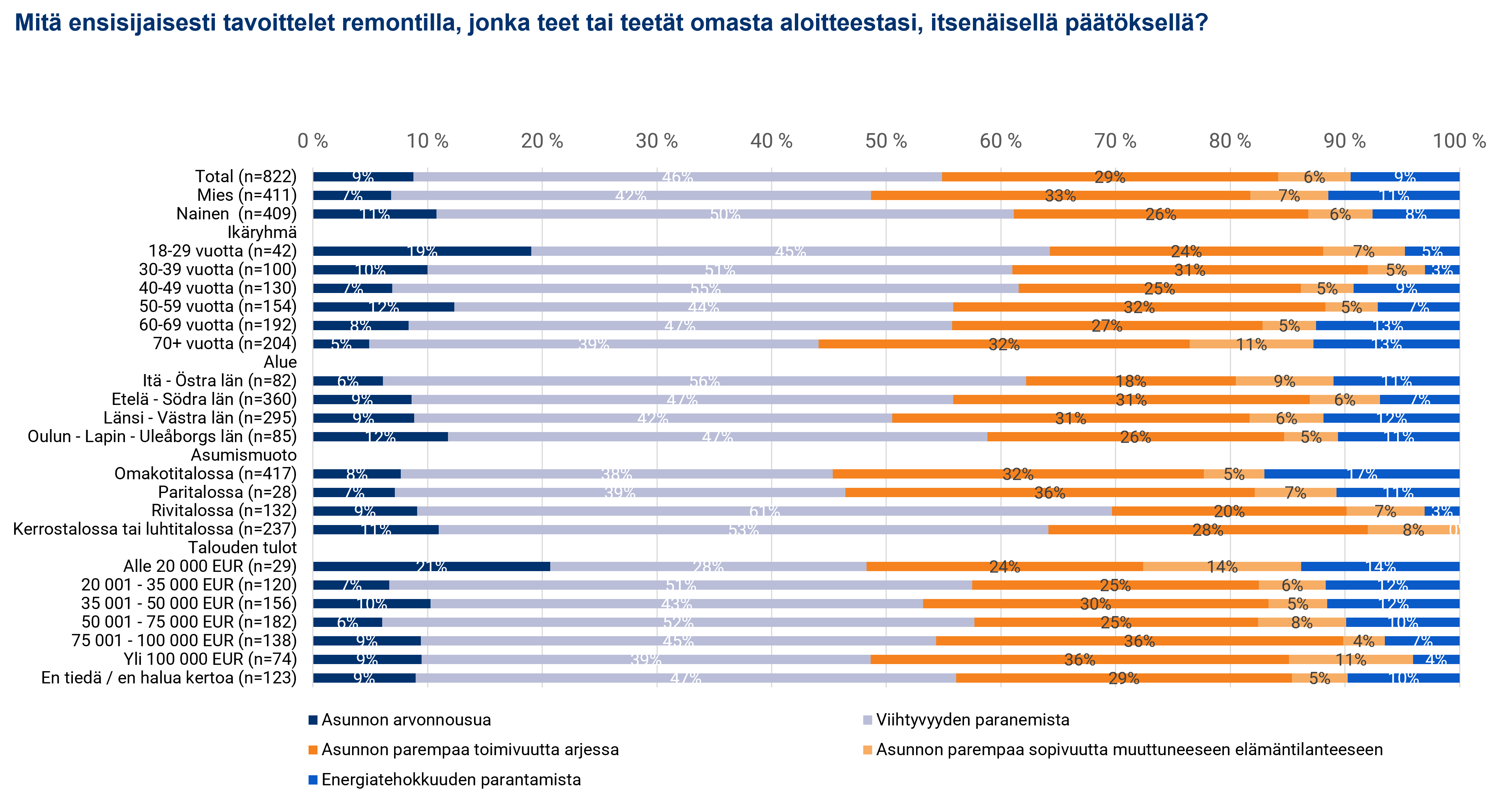 Remontin joskus tehneille esitettiin jatkokysymys siitä, mitä he ensisijaisesti tavoittelevat remontilla. Vastaajia pyydettiin huomioimaan ainoastaan sellaiset remontit, joita he päättävät tehdä tai teettää omasta aloitteestaan itsenäisellä päätöksellä. Kysymys ei siis koskenut esimerkiksi kerrostaloyhtiön määräämiä ”pakollisia” remontteja.