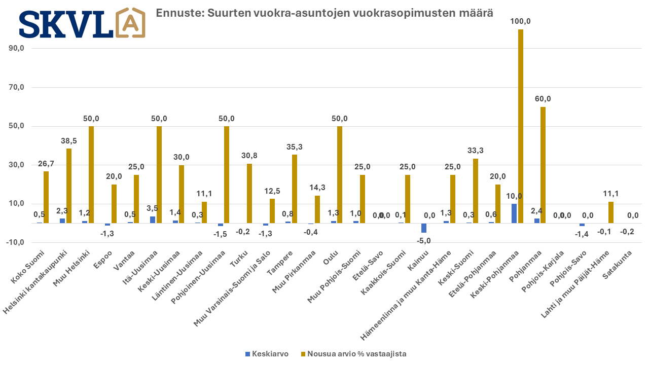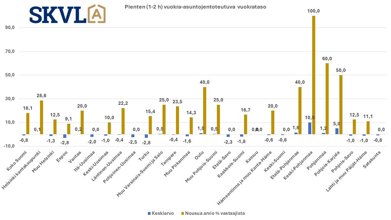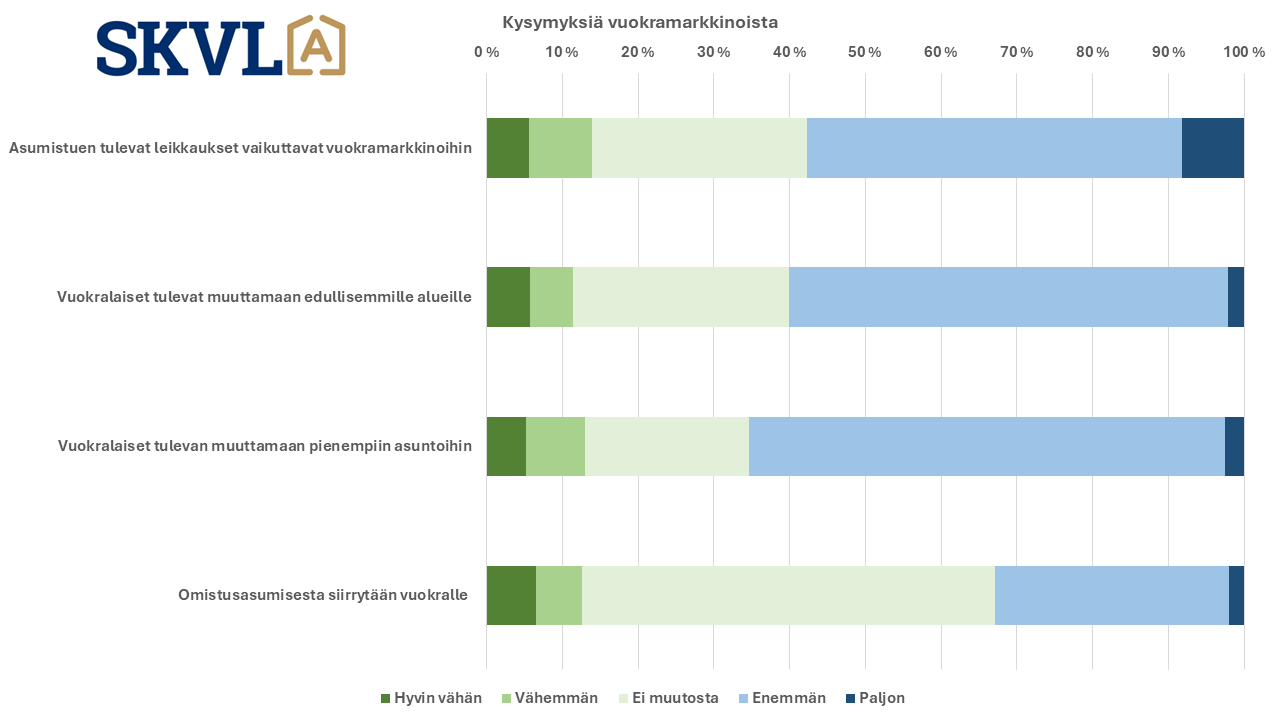 Kyselyssä selvitettiin sitä mitä asumistuen muutokset ja yleinen markkinatilanne vaikuttaa vuokra-asuntomarkkinoihin. Selvä trendi on nyt, että vuokralaiset vaihtavat edullisempiin vuokra-asuntoihin joko edullisemmalle alueelle tai pienempiin asuntoihin. Ennusteen mukaan vuokriin ei ole tulossa merkittävää nousua lukuun ottamatta Pohjois-Suomea ja osia Pohjanmaasta sekä Pohjois-Karjalasta. Vuokra-asuntojen kysyntä pienimmissä asunnoissa ei edelleenkään ole yhtä suurta kuin tarjonta, joten erityisesti niissä ei tulla näkemään vuokrien nousua. Tämä osaltaan hidastaa sijoittajien innostusta pieniin asuntoihin. Vastikkeiden nousu ja korkeammat korot useimmissa taloyhtiöissä asettaa kuitenkin jatkuvasti painetta vuokrien korotuksiin.