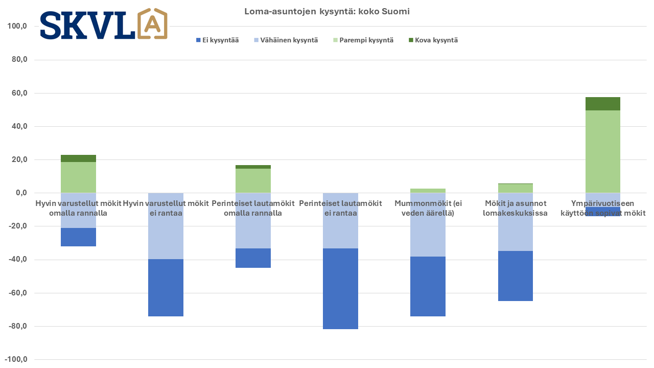 Ympärivuotiseen käyttöön soveltuvien loma-asuntojen kiinnostus on selvästi korkeinta mökkikaupassa. Edelleen hyväkuntoiset ja hyvin varustellut mökit suurten vesistöjen rannoilla ovat suosituimpia mökkityyppejä. Mökkikaupassa nähdään kuitenkin yleisen taloustilanteen vaikutus ja on palattu selvästi koronaa edeltävään markkinatilanteeseen, jossa hyväkuntoiset ja oikeassa sijainnissa olevat mökit käyvät kaupaksi kuten ennenkin ja kauppa alkaa käydä, kun kesäsesonki lähtee käyntiin.