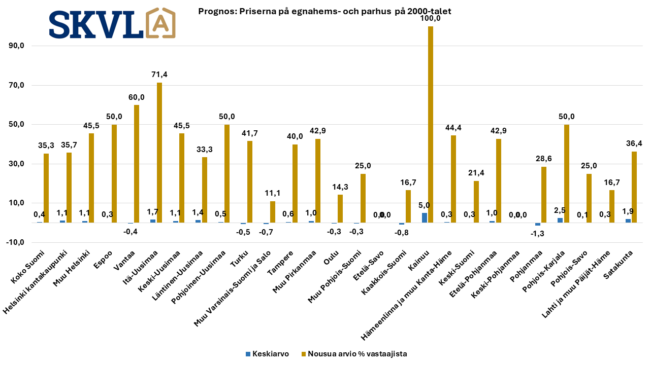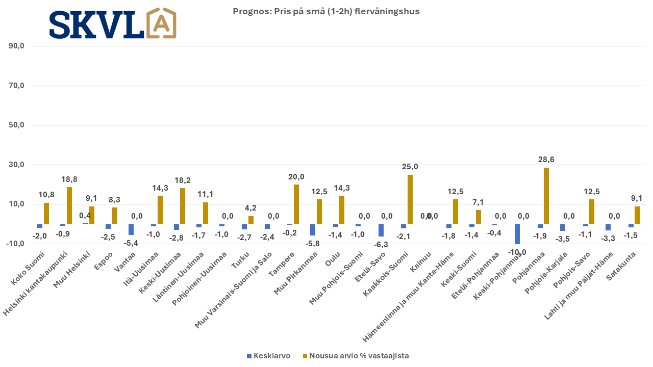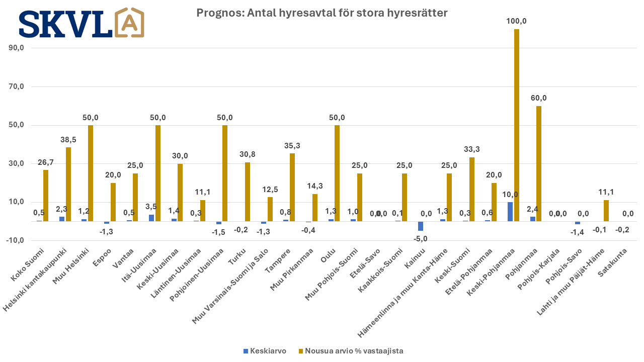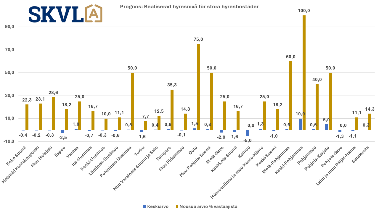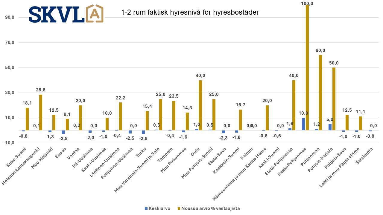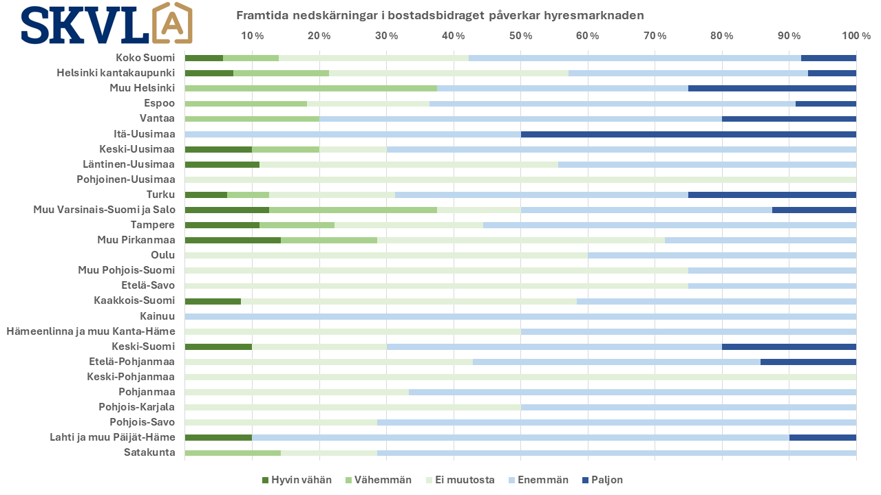 I enkäten utreddes hur förändringarna i bostadsbidraget och det allmänna marknadsläget påverkar hyresbostadsmarknaden. Det finns nu en tydlig trend att hyresgäster byter till billigare hyresrätter, antingen i ett mer prisvärt område eller mindre lägenheter. Enligt prognosen kommer hyrorna inte att höjas nämnvärt, med undantag för Norra Finland och delar av Österbotten och Norra Karelen. Efterfrågan på hyresbostäder i de minsta bostäderna är ännu inte lika stor som utbudet, så hyrorna kommer inte att stiga särskilt i dem. Detta bidrar till att bromsa investerarnas entusiasm för små lägenheter. Högre avgifter och högre räntor i de flesta bostadsbolag sätter dock ständigt press på hyreshöjningarna.