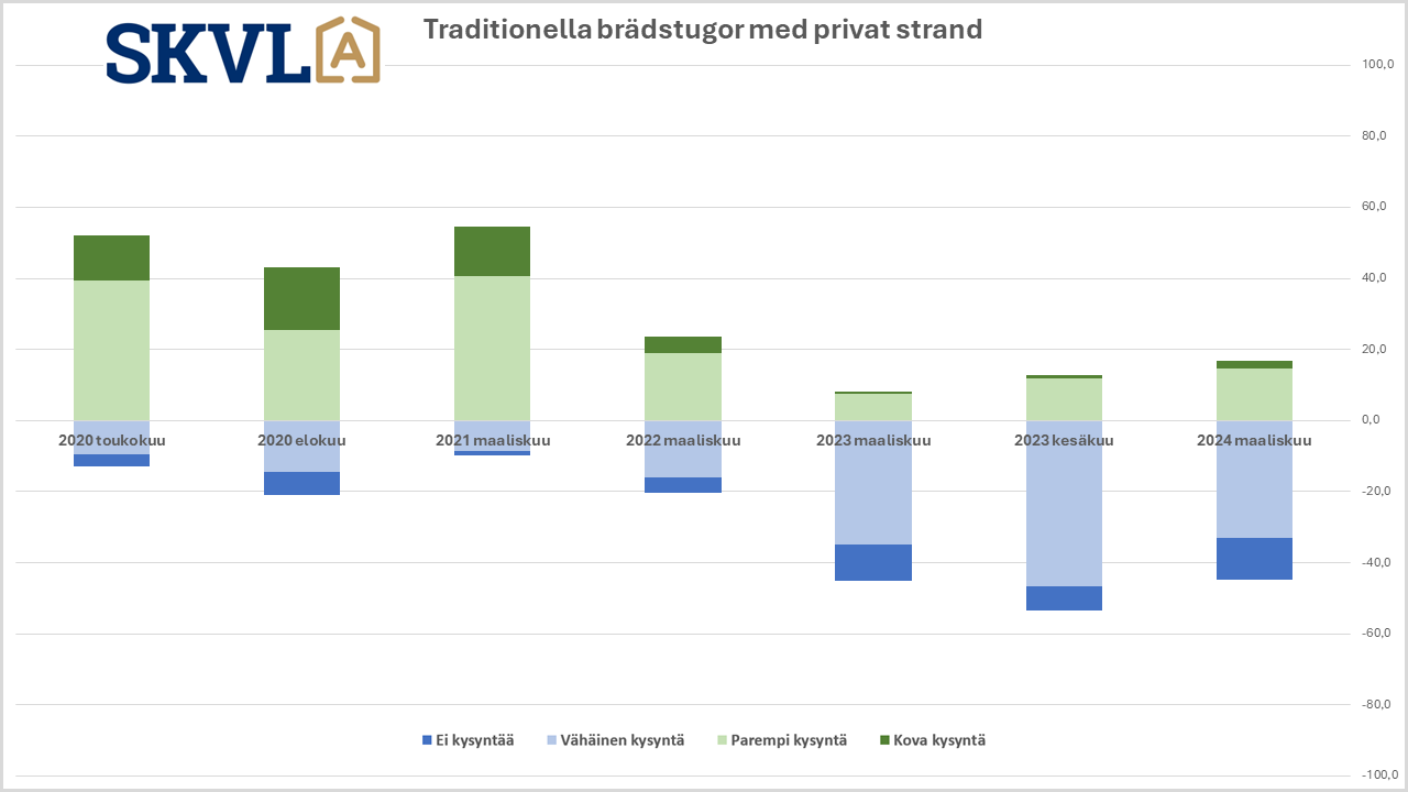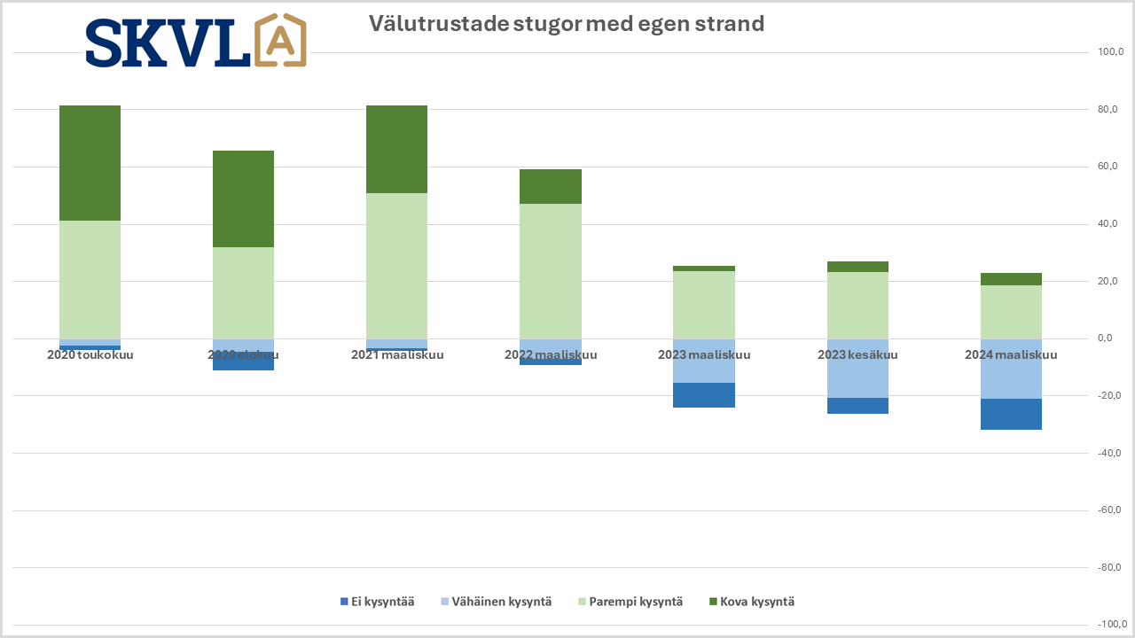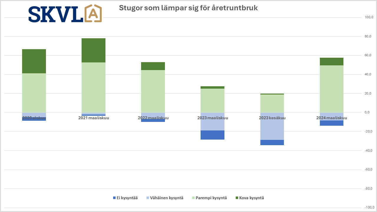 Intresset för fritidsbostäder som lämpar sig för åretruntbruk är klart störst vid stugförsäljning. Stugor i gott skick och välutrustade vid stranden av stora vattendrag är fortfarande de populäraste typerna av stugor. Stugförsäljningen ser dock effekterna av det allmänna ekonomiska läget och har tydligt återgått till marknadssituationen före corona, där stugor i gott skick och i rätt läge säljs som tidigare och försäljningen börjar ske när sommarsäsongen börjar.
