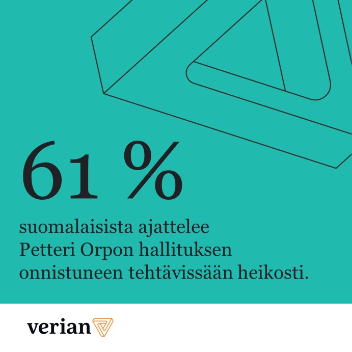 Tutkimusyhtiö Verianin puoluebarometri kertoo, että 61 prosenttia suomalaisista ajattelee Petteri Orpon hallituksen onnistuneen tehtävissään heikosti. Hallitus on toiminut huonosti 38:n ja melko huonosti 23 prosentin mielestä.