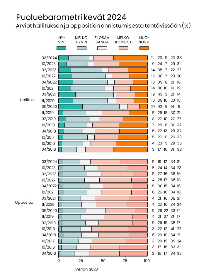 Tutkimusyhtiö Verian on toteuttanut Puoluebarometrin 18.–25.3.2024. Tutkimus on toteutettu Forum-vastaajapaneelissa. Haastateltu joukko edustaa maamme 18 vuotta täyttänyttä väestöä (pl. ahvenanmaalaiset). Haastattelujen kokonaismäärä on 1372. Tutkimustulosten virhemarginaali on 2,6 prosenttiyksikköä suuntaansa.