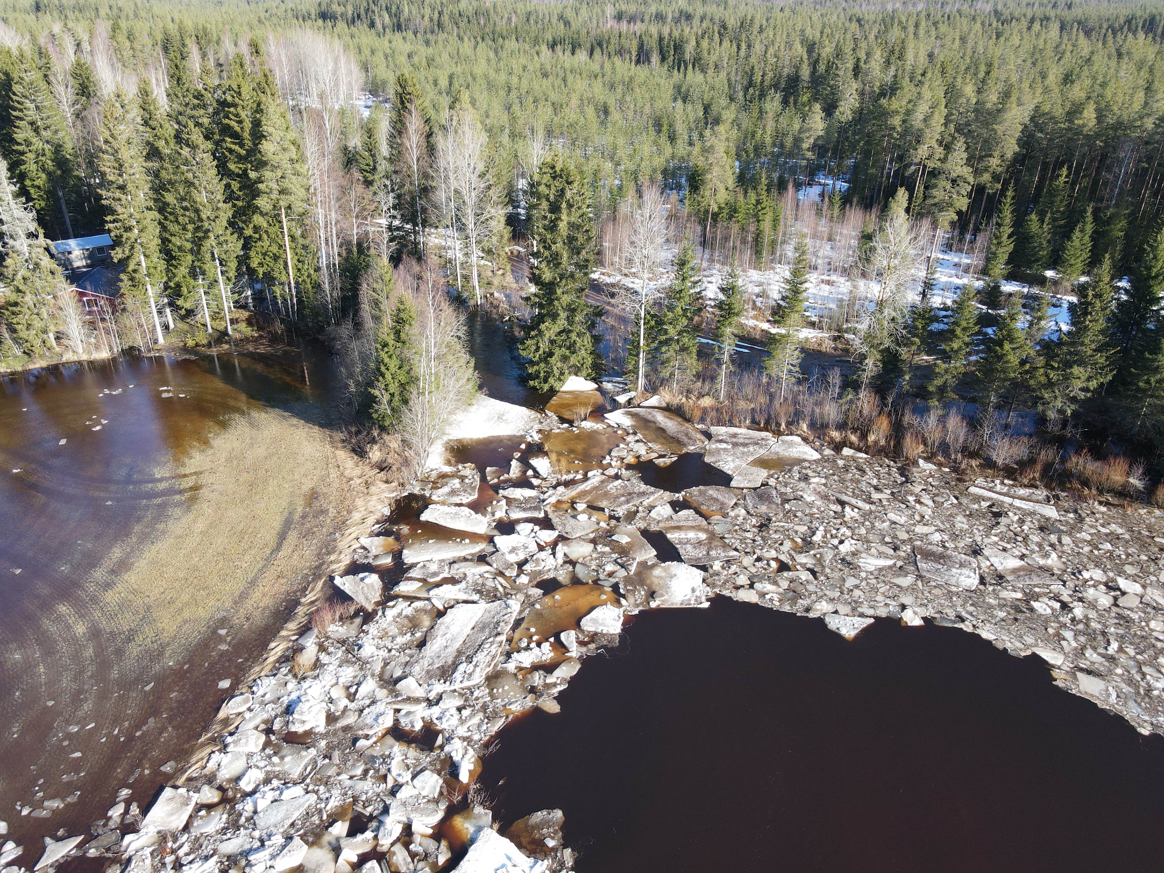 I Lestijoki å har isen börjat röra på sig i forsplatserna. Isen kan börja samla sig och snabbt höja vattenytan lokalt.