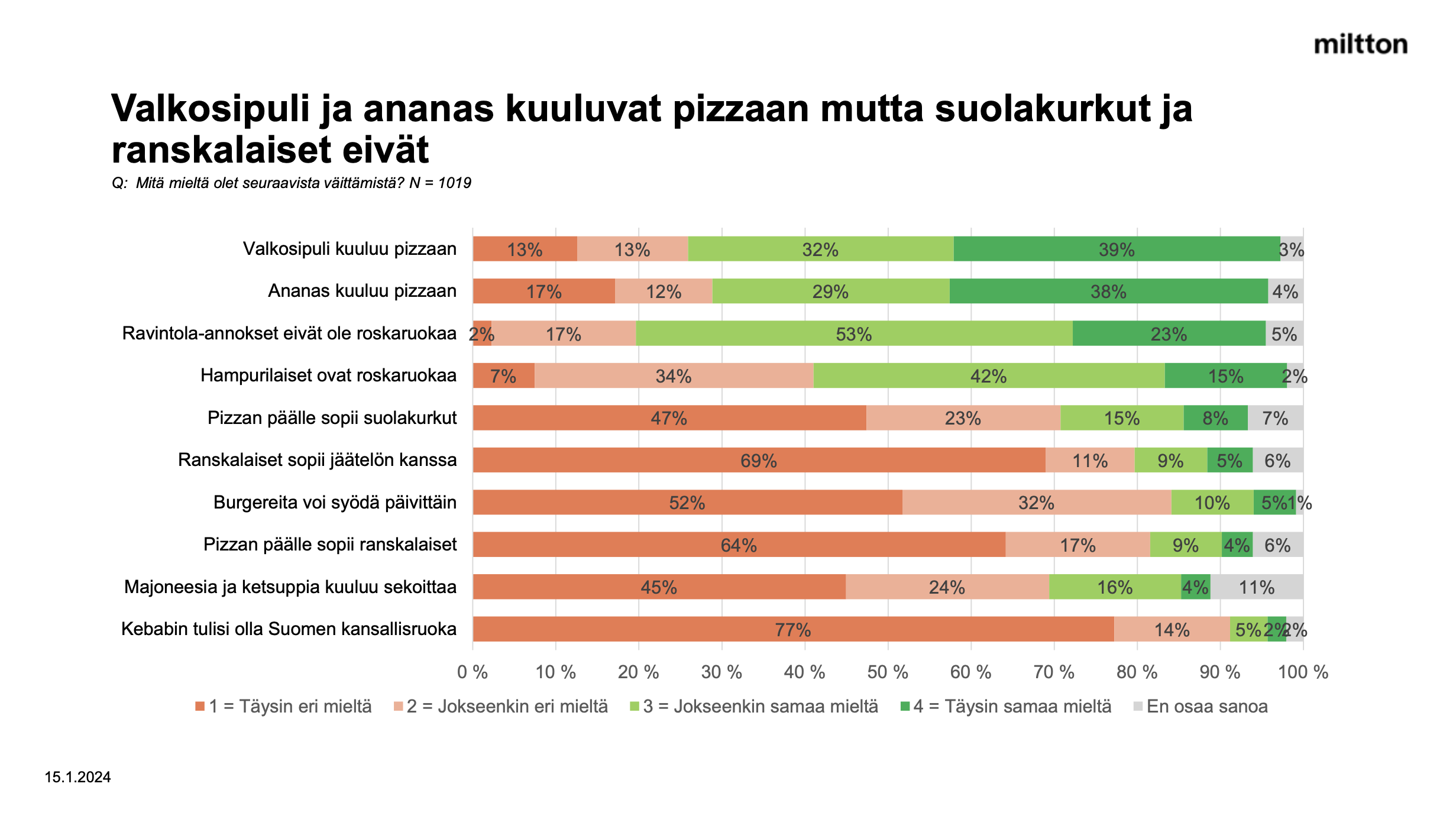 Foodora tutki, miten suomalaiset reagoivat erilaisiin ruokaväittämiin. Tutkimukseen vastanneiden mukaan valkosipuli ja ananas kuuluvat pizzaan, kun taas suolakurkut ja ranskalaiset eivät. Suosiotaan kasvattanut trendi, ranskalaisten dippaaminen jäätelöön, sai vastaajilta myös tyrmäyksen. Lisäksi vanha kikka, majoneesin ja ketsupin sekoittaminen, ei ole suotavaa.