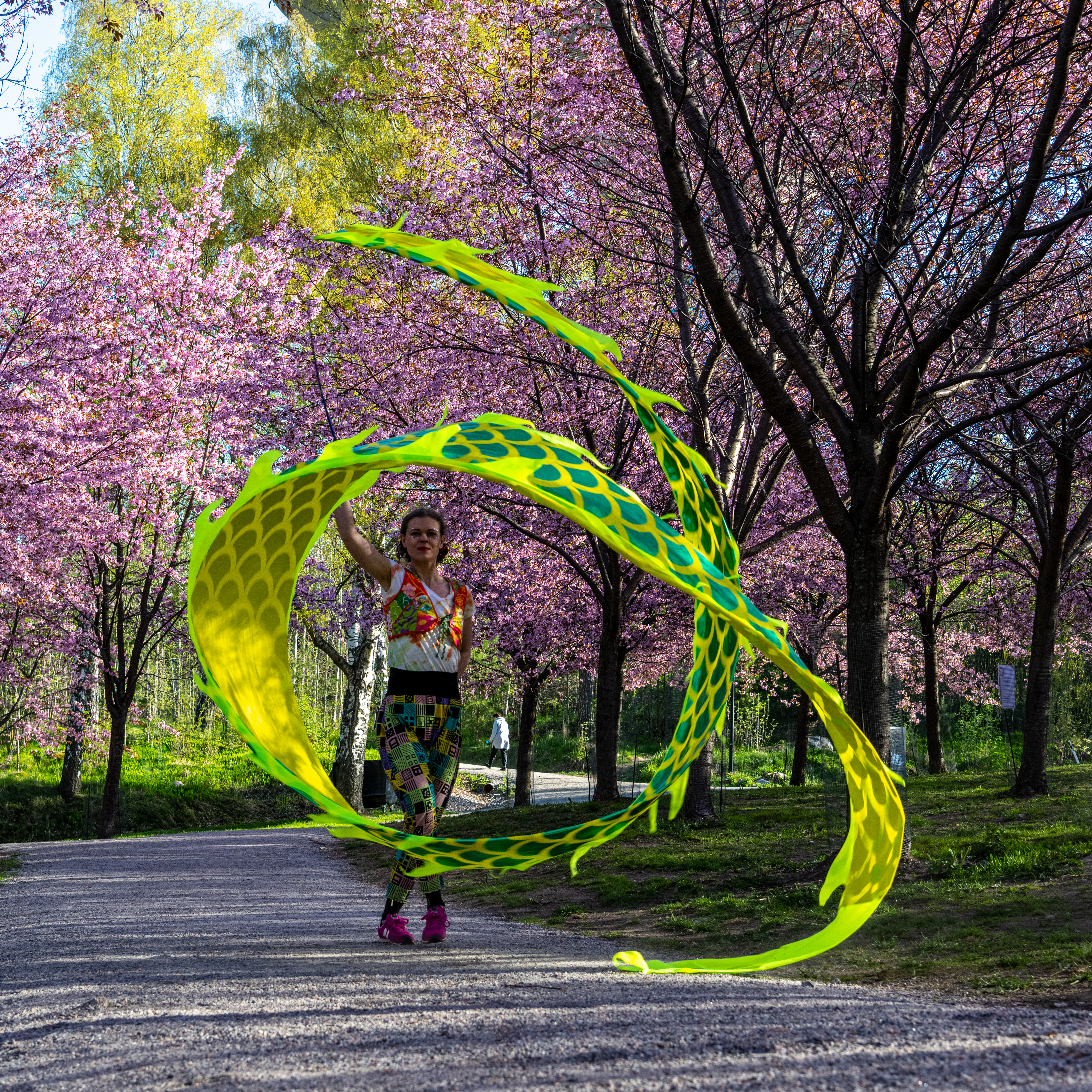 Piha-alueella kiertävä Roihun esitys ja kevään väreissä hohkaavat sirkusvälineet.