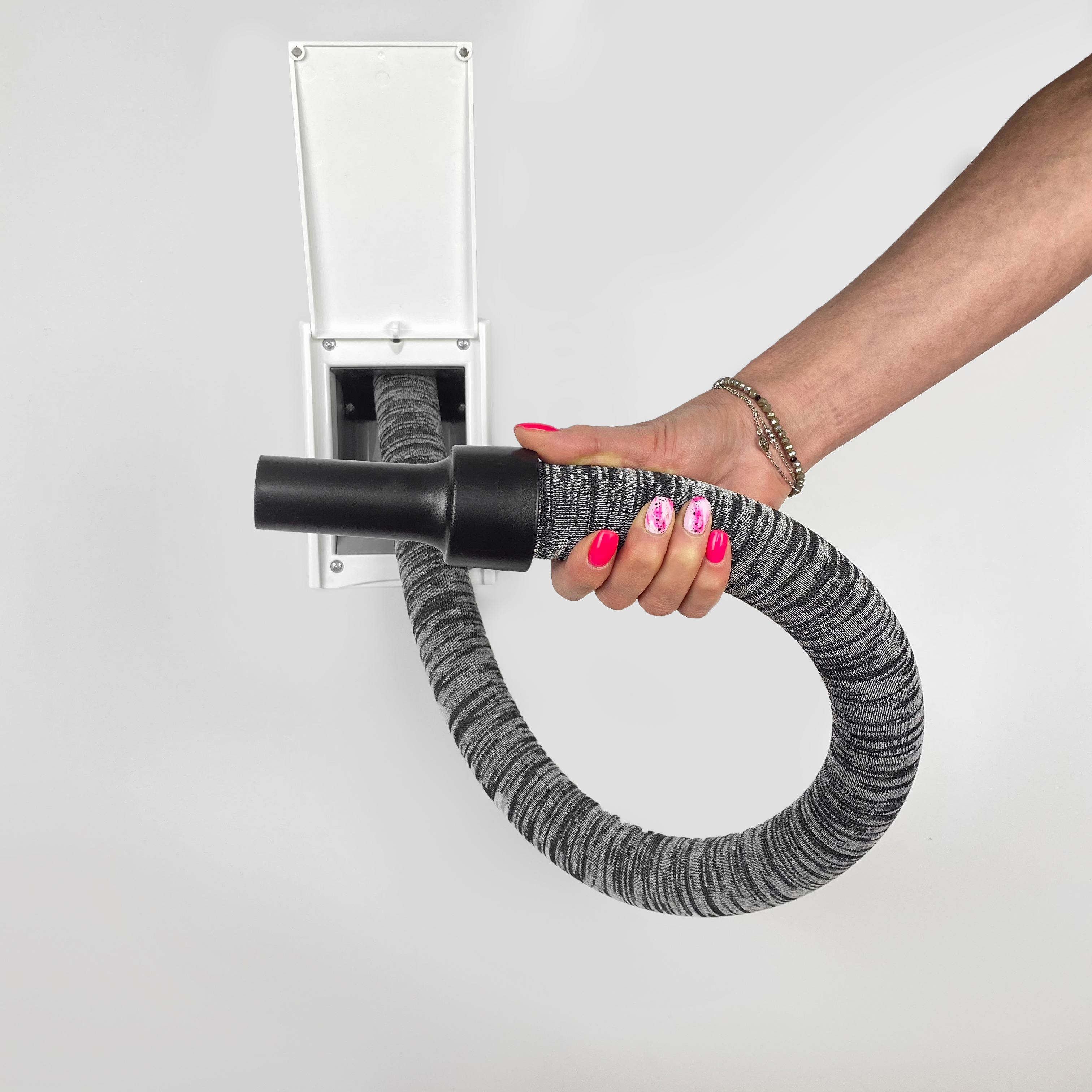Seinän sisään imaistavassa siivousletkussa on tekstiilipinta, joka on paitsi tyylikäs, myös miellyttävän tuntuinen käyttää. Vaikka kyseessä onkin tekstiilipinta, on se kuitenkin sileä ja likaahylkivä.