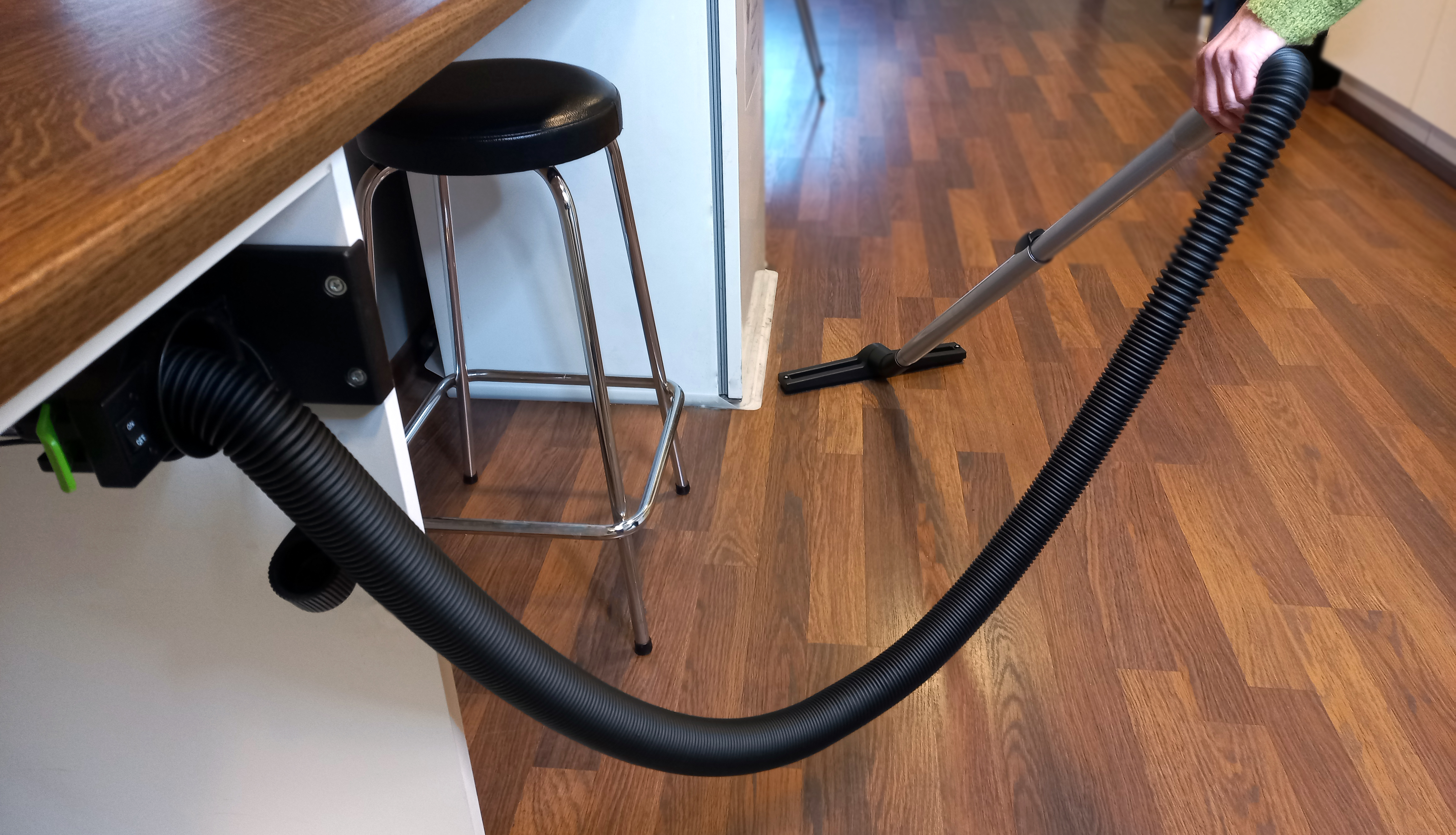 Erityisesti keittiössä olisi näppärä olla imuri aina sopivasti käden ulottuvilla. Nyt sekin on mahdollista, sillä venyvän RV-siivousletkun joustava säilytysputki voidaan asentaa, vaikka kaapin sisälle tai piiloon sokkelilevyn taakse. Siivousletku saadaan yhdistettyä olemassa olevaan putkistoon helposti yhdyskappaleen avulla. On imuroitava kohta sitten metrin tai kymmenen päässä, nappaa vain kiinni letkun päästä, vedä letkua ulos tarvittava määrä, imuroi ja imaise letku takaisin säilytysputkeensa. Näppärää ja nopeaa.