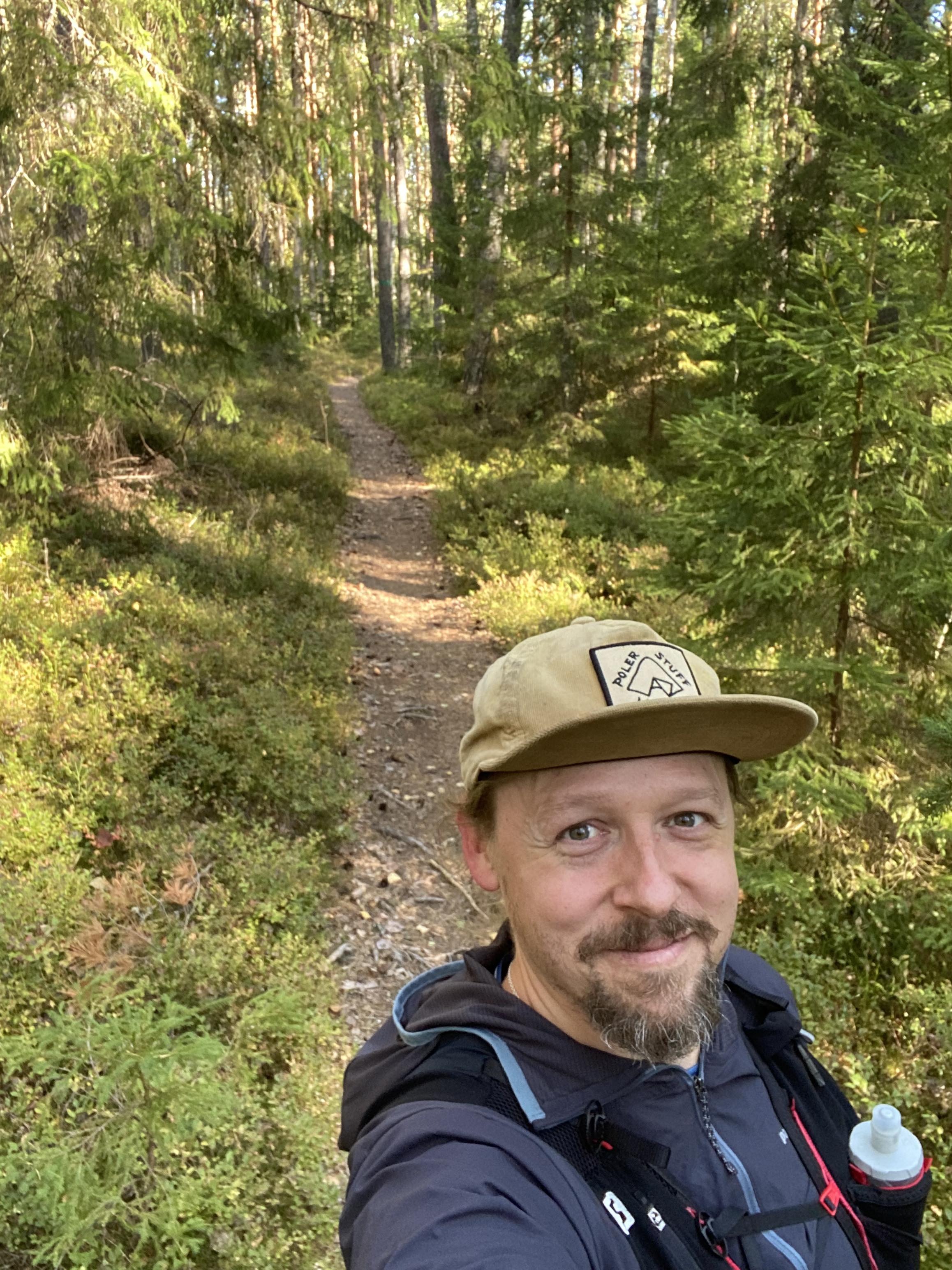 Heikki Lehti hymyilee metsäpolulla lippis päässä.