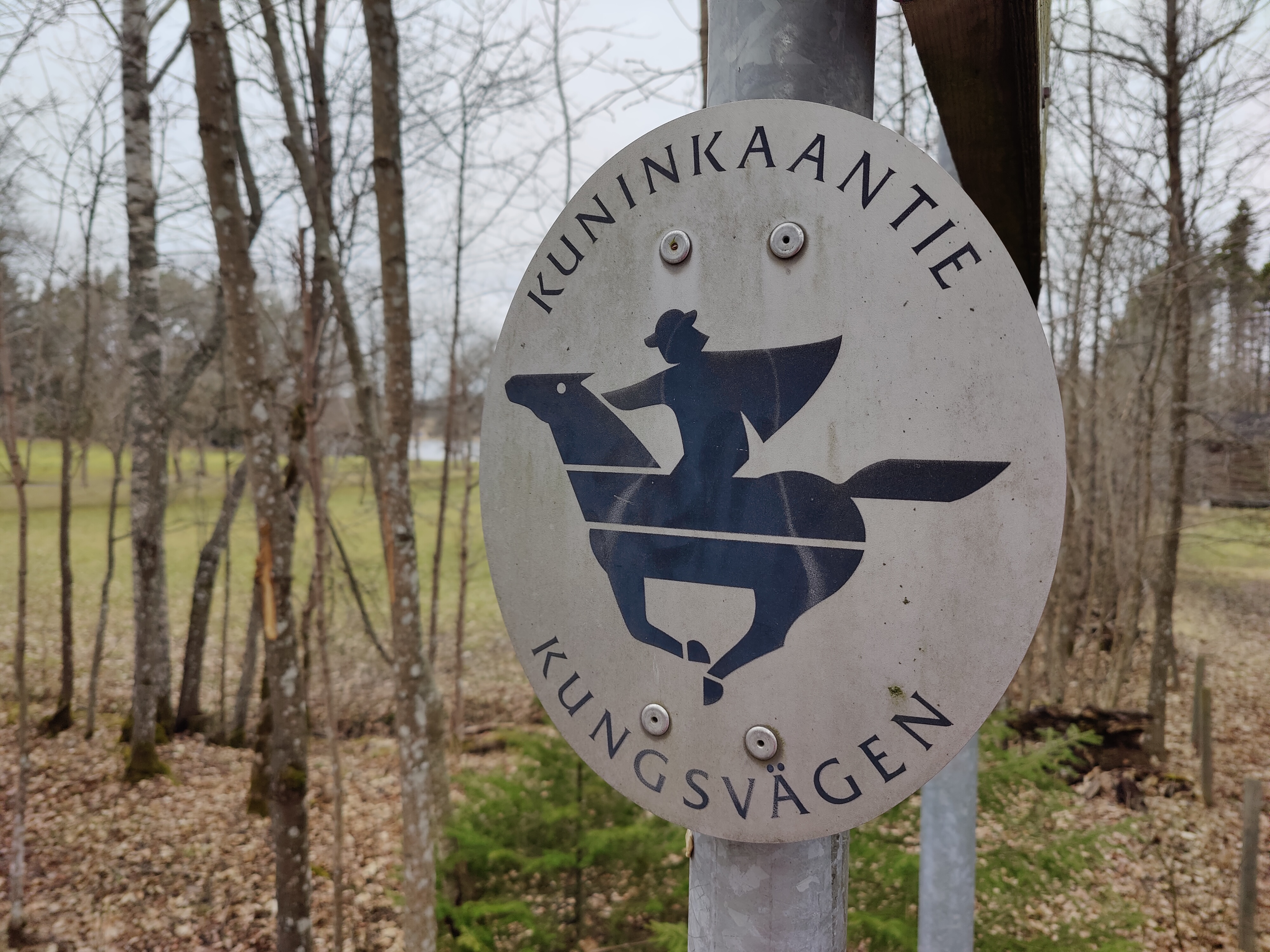 Kuninkaantien pyöreä kyltti tien varressa, kuvassa tyylitelty ratsastaja.