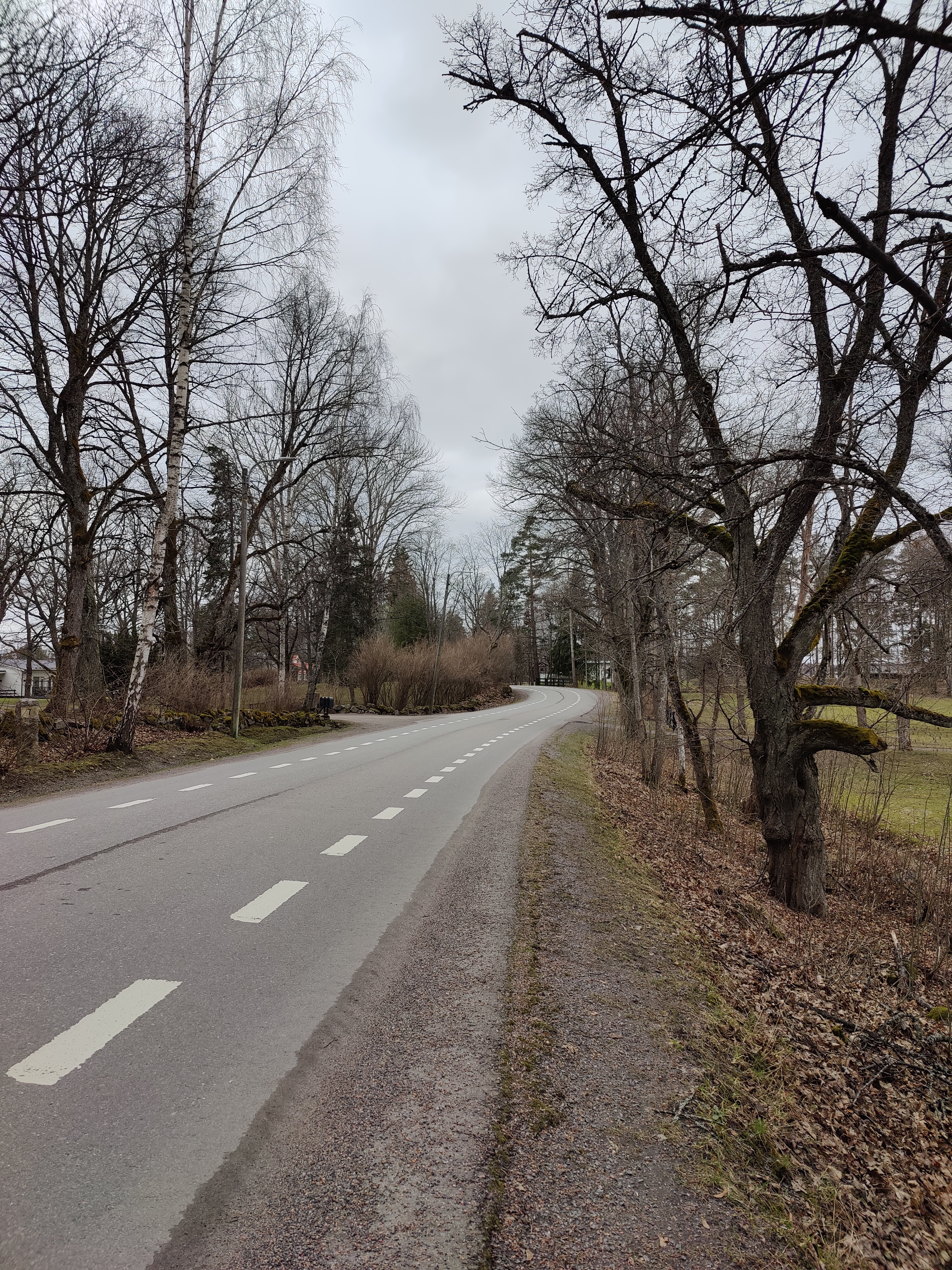 Asfaltoitu kylätie lumettomassa kevätmaisemassa.