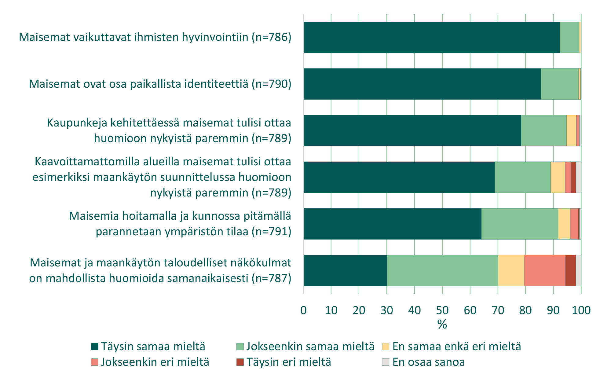 Statistisk figur över fördelningen av svar på en femgradig skala för frågan: hur mycket håller du med eller inte håller med om följande påståenden? Flest höll med (99 % helt eller delvis överens) med påståendet "landskap påverkar människors välbefinnande". Minst höll med (30 % helt överens och 40 % delvis överens) med påståendet "det är möjligt att samtidigt beakta landskap och markanvändningens ekonomiska aspekter". En mer omfattande textuell beskrivning av figurinnehållet finns i en rapport som presenterar resultat från landskapsundersökningsstudier.