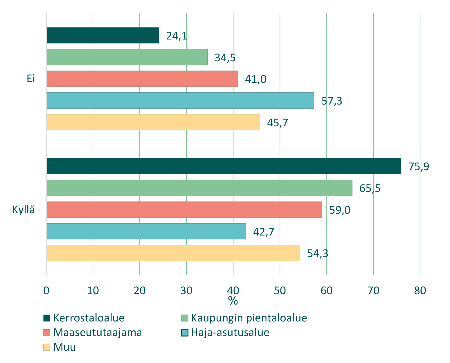 Statistisk figur över fördelningen av ja/nej-svar på frågan: skulle du vilja ändra något i ditt vardagslandskap? Svaren är uppdelade beroende på vilken typ av vardagslandskap det handlar om. Av de som placerade sitt vardagslandskap i ett bostadsområde med flerfamiljshus, skulle hela tre av fyra (75,9 %) vilja ändra något i sin miljö. I glesbygden är man mest nöjd med den nuvarande situationen, eftersom färre än andra skulle vilja ändra något i sitt vardagslandskap där (42,7 %). En mer omfattande textuell beskrivning av figurinnehållet finns i en rapport som presenterar resultat från landskapsundersökningsstudier.