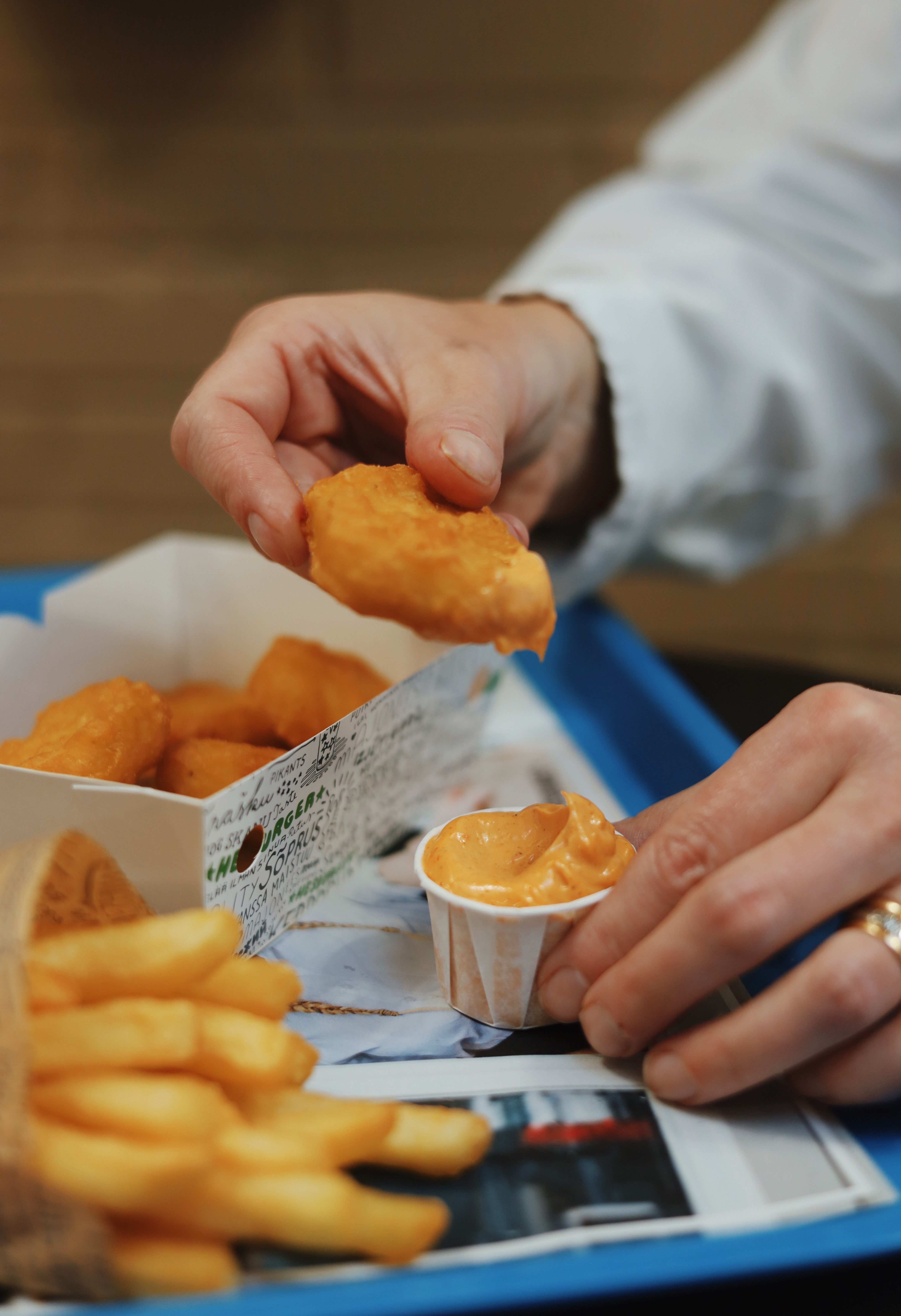 ”Monet majoneesin ystävät kaatavat majoneesipussin sisällön kuppiin sellaisena kuin se saadaan. Näin majoneesikuppi täyttyy äärimmilleen. Yksi tapa onkin laittaa kuppi pöydälle ja avata sitä reunoista, jolloin se levenee pienen kuperan lautasen muotoiseksi. Näin kuppiin mahtuu enemmän majoneesia ja dippauskokemus on kokonaisvaltaisempi”, Pohjonen ohjeistaa.