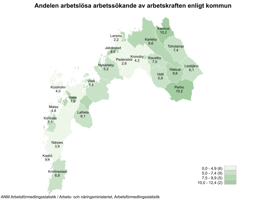 Antalet arbetslösa arbetssökande ökade i de flesta ekonomiska regionerna inom området för NTM-centralen i Österbotten jämfört med året innan. Antalet arbetslösa ökade mest i Vasa ekonomiska region (+ 548) och minskade endast i Sydösterbotten (- 58). Andelen arbetslösa arbetssökande av arbetskraften var störst i Perho och Kannus (10,2 %). Andelen arbetslösa arbetssökande av arbetskraften var lägst i Larsmo (2,2, %) kommun. Arbetslöshetsgraden i Vasa var 7,9 %, i Karleby 8,6 % och i Jakobstad 8,6 %. Jämfört med året innan har antalet lediga arbetsplatser i kommunerna inom området för NTM-centralen i Österbotten minskat totalt med 2 773 platser (-43 %).