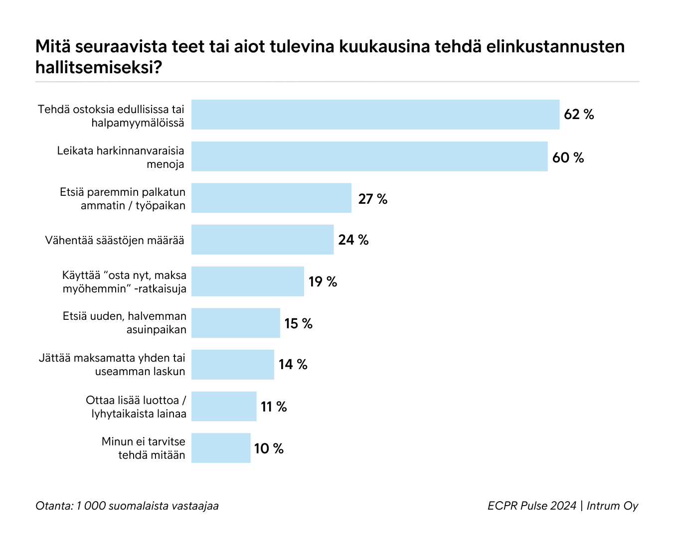 Inflaation hidastuminen on vahvistanut joidenkin kuluttajien tulevaisuudennäkymiä, mutta elinkustannusten pysyessä edelleen korkealla, kuluttajilla on yhä vähemmän ostovoimaa. Pakollisten menojen jälkeen mahdollisuudet säästöjen kerryttämiseen tai harkinnanvaraisiin vapaa-ajan hankintoihin ovat aiempaa niukemmat. Suomalaisten kotitalouksien menoista valtaosa (62 prosenttia) kuluu välttämättömiin maksuihin, mikä on huomattavasti enemmän kuin Euroopassa keskimäärin (56 prosenttia). Suomalaisilla harkinnanvaraisiin menoihin jää keskimäärin 23 prosenttia ja säästöihin tai lainanmaksuun vain 15 prosenttia, kun Euroopassa luvut ovat 25 ja 19 prosenttia. Yleisesti suositeltu jakauma olisi 50, 30 ja 20 prosenttia.