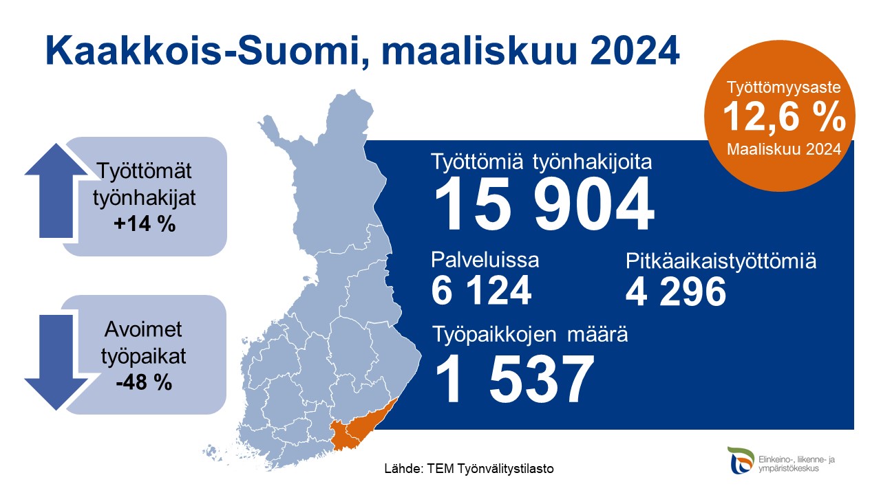 Kaakkois-Suomen työ- ja elinkeinotoimistossa oli maaliskuun lopussa 15904 työtöntä työnhakijaa. Työttömien määrä on 1979 henkilöä (+14 %) suurempi kuin vuotta aikaisemmin.