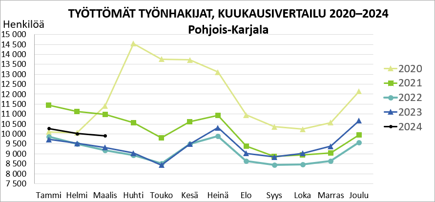 Pohjois-Karjalassa oli maaliskuun lopussa 9 902 työtöntä työnhakijaa, joista 1 097 oli lomautettuna. Vuoden takaiseen verrattuna työttömien määrä oli 584 henkilöä (6 %) suurempi. Lomautettujen määrä kasvoi 314 henkilöllä (40 %).
