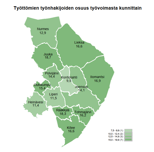 Työttömät työnhakijat kunnittain, Pohjois-Karjala, maaliskuu 2024.