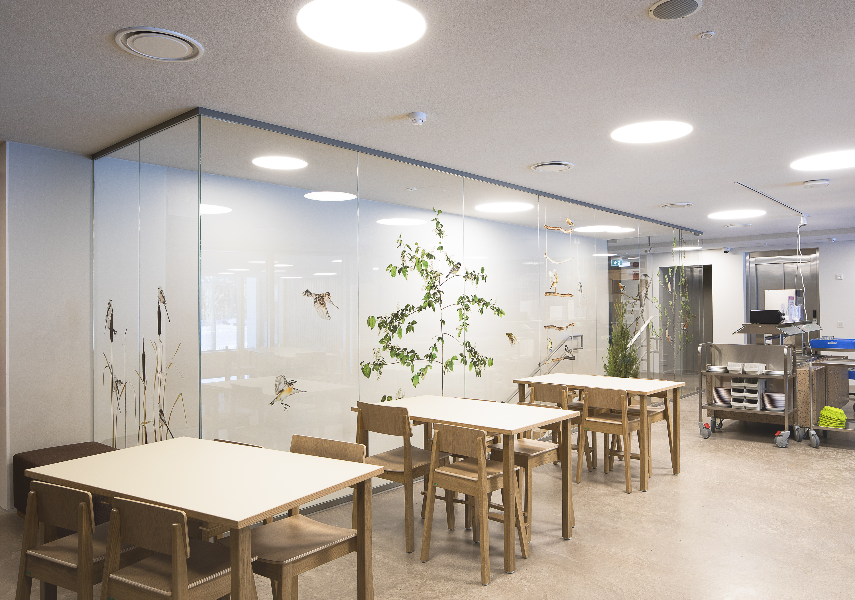 Sanna Kannistos verk Skogen kallar tar in närmiljön och inbjuder till att observera fåglar och natur. På daghemmet Nuotti ger fototrycken av fåglar och träd på glasytorna i trapphuset ett uppfriskande och lugnande intryck. Här ses bl.a. en blåmes som mellanlandat på en aspgren och domherrar, en gråsiska och en buskskvätta som flaxar mellan grenarna på inhemska träd. Repstegen i vilken det bl.a. sitter en ängspiplärka och en lövsångare tillför verket lekfullhet. I verket ingår vidare inramade foton av en järnsparv, grönfinkar i en poppel och en pärluggla. Daghemmet är planerat av Verstas Arkkitehdit Oy.