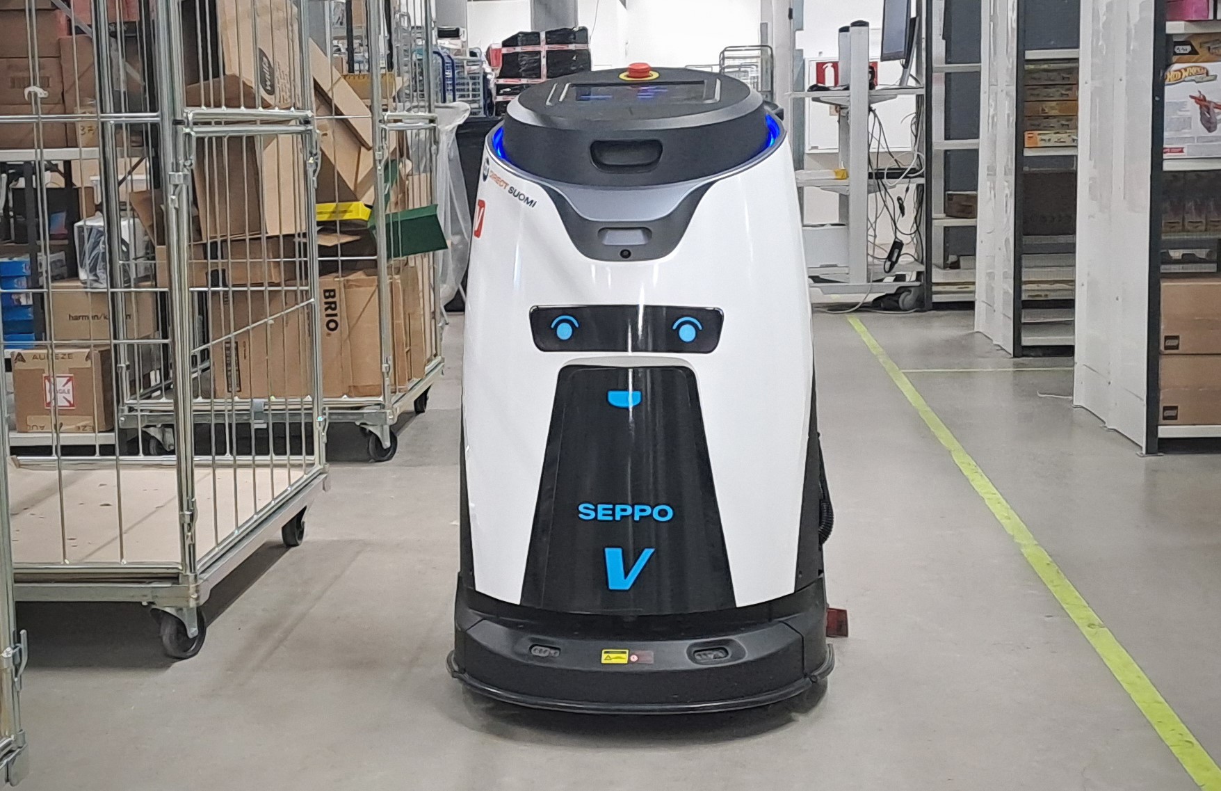 Siivousrobotti Seppo puhdistaa varastotiloja.