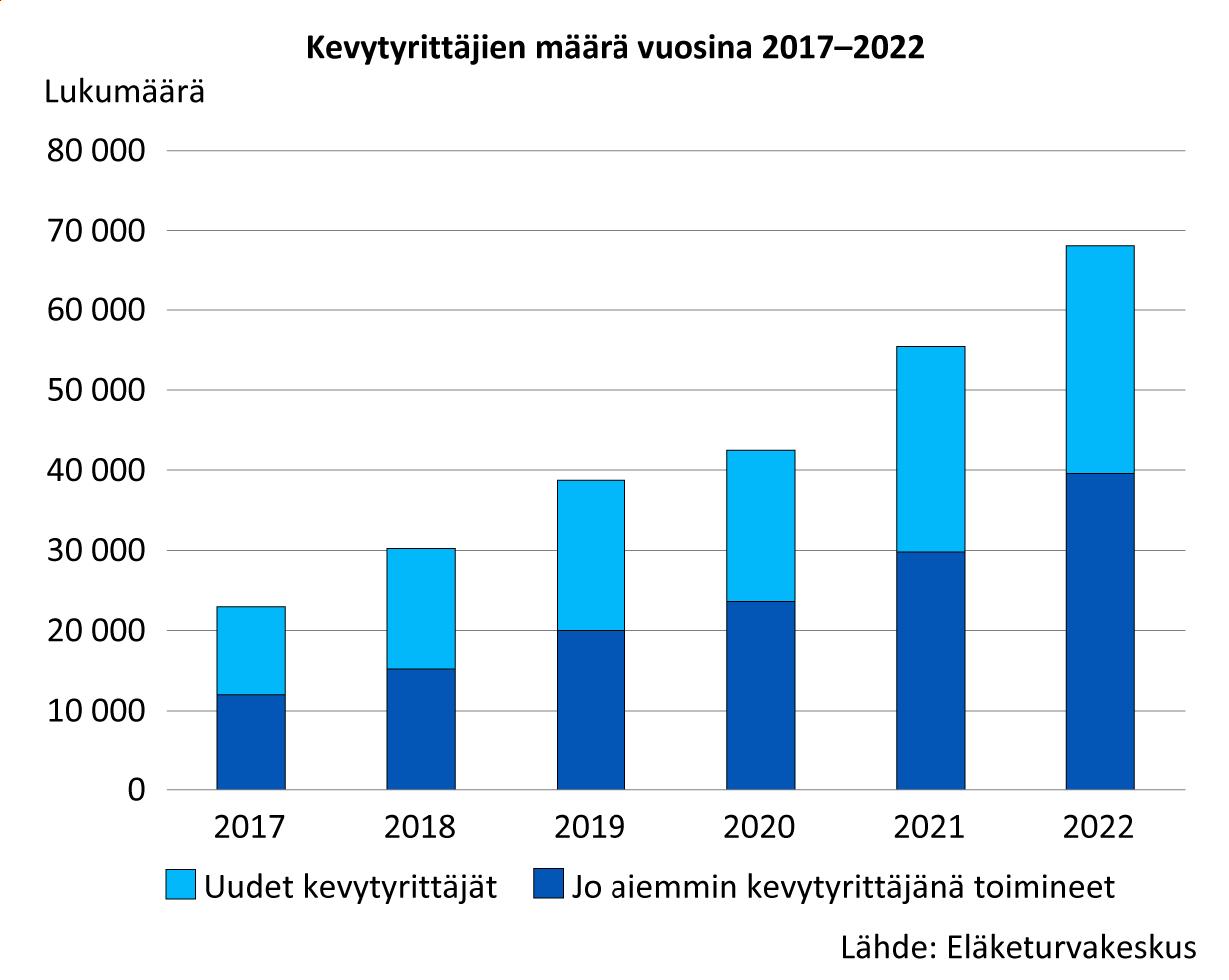 Tutkimuksen mukaan vuonna 2017 noin 23 000 kevytyrittäjää sai tuloja laskutuspalveluyritysten kautta. Vuonna 2022 heitä oli jo lähes kolminkertainen määrä: 68 000.