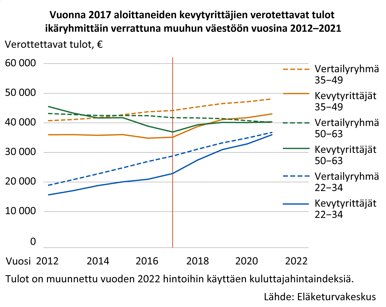 Kevytyrittäjien määrä on kasvanut nopeasti viime vuosina. Samaan aikaan kevytyrittäjien profiili näyttää muuttuneen: he ovat entistä nuorempia, yhä useampi on ulkomaalaistaustainen ja suorittanut vain perusasteen koulutuksen. Eläketurvakeskuksen (ETK) tutkimuksessa on tarkasteltu ensi kertaa kevytyrittäjien urapolkuja, tuloja ja eläkekertymää usean vuoden ajanjaksolla.