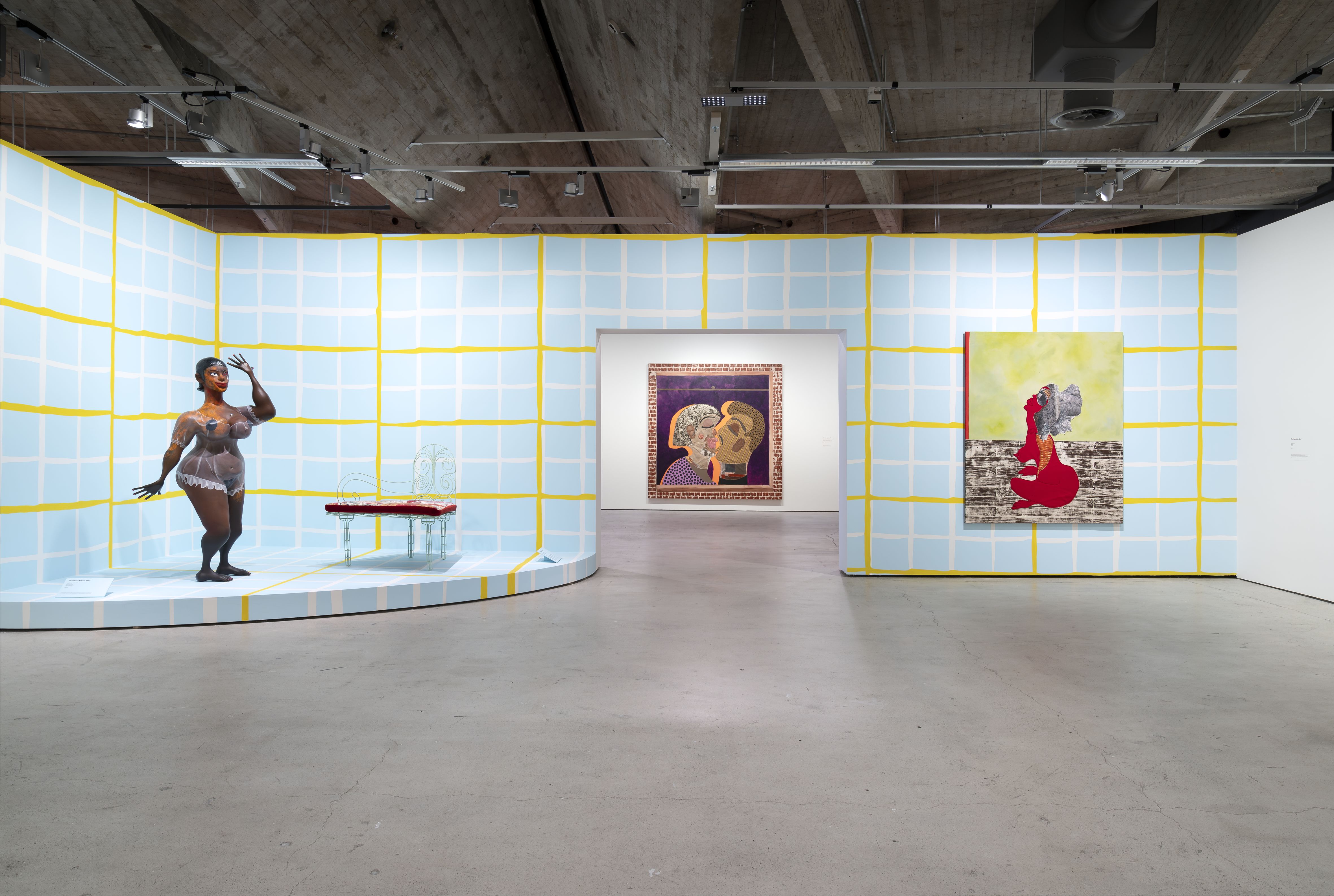Utställningen Från samma kvarter (Around the Way) består av konstnärens senaste målningar och skulpturer i människostorlek samt tre målningar som utförts enkom för utställningen. Den rumsliga visningen på EMMA bjuder in betraktaren att dryfta frågor kring identitet och representation.