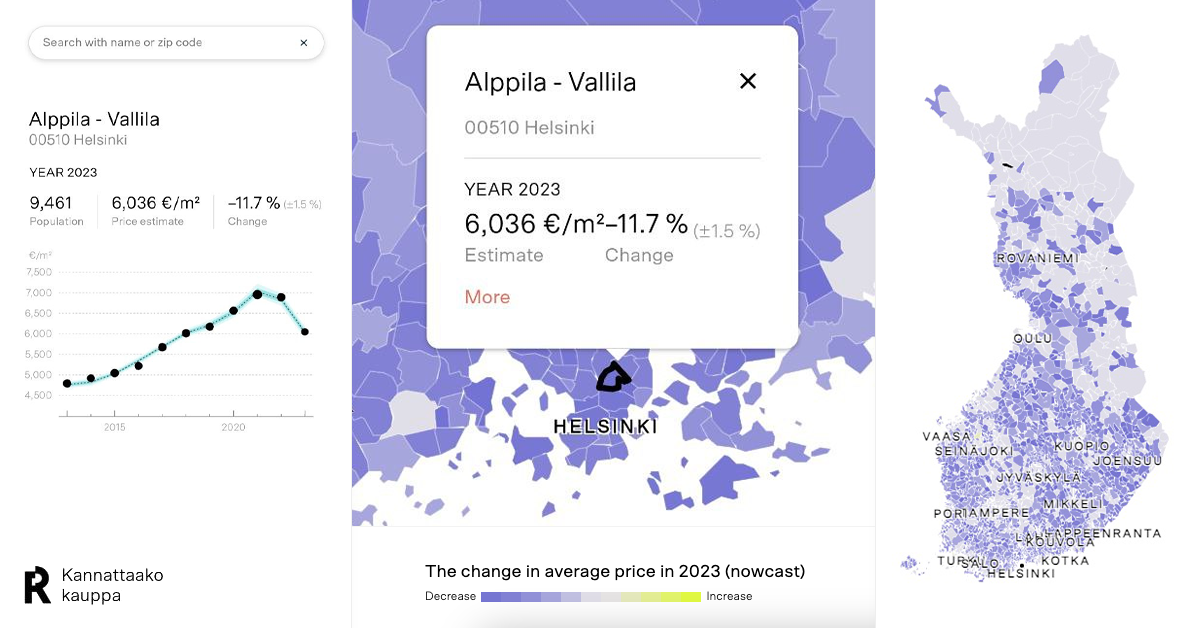 “Palvelu mallintaa tekoälyn ja koneoppimisen avulla hinnanmuutokset myös haja-asutusalueille, joissa kauppoja on vuodessa hyvin vähän. Suurin osa Suomen postinumeroalueista on juuri tällaisia alueita”, Aalto kertoo.