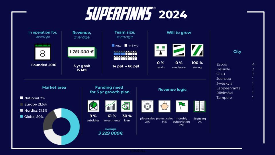 Kansainvälistyminen on olennainen osa SUPERFINNS-yritysten kasvusuunnitelmaa. Tällä hetkellä keskimäärin 36% yritysten liikevaihdosta on vientiä, ja 93% haluaa laajentaa toimintaansa USA:n ja Kanadan sekä EU- ja ETA-maiden markkinoille. Jotta kansainvälinen kasvuloikka toteutuu, yritykset etsivät rahoitusta keskimäärin 3,2 miljoonaa euroa, joka koostuu pääasiassa sijoituksissa.