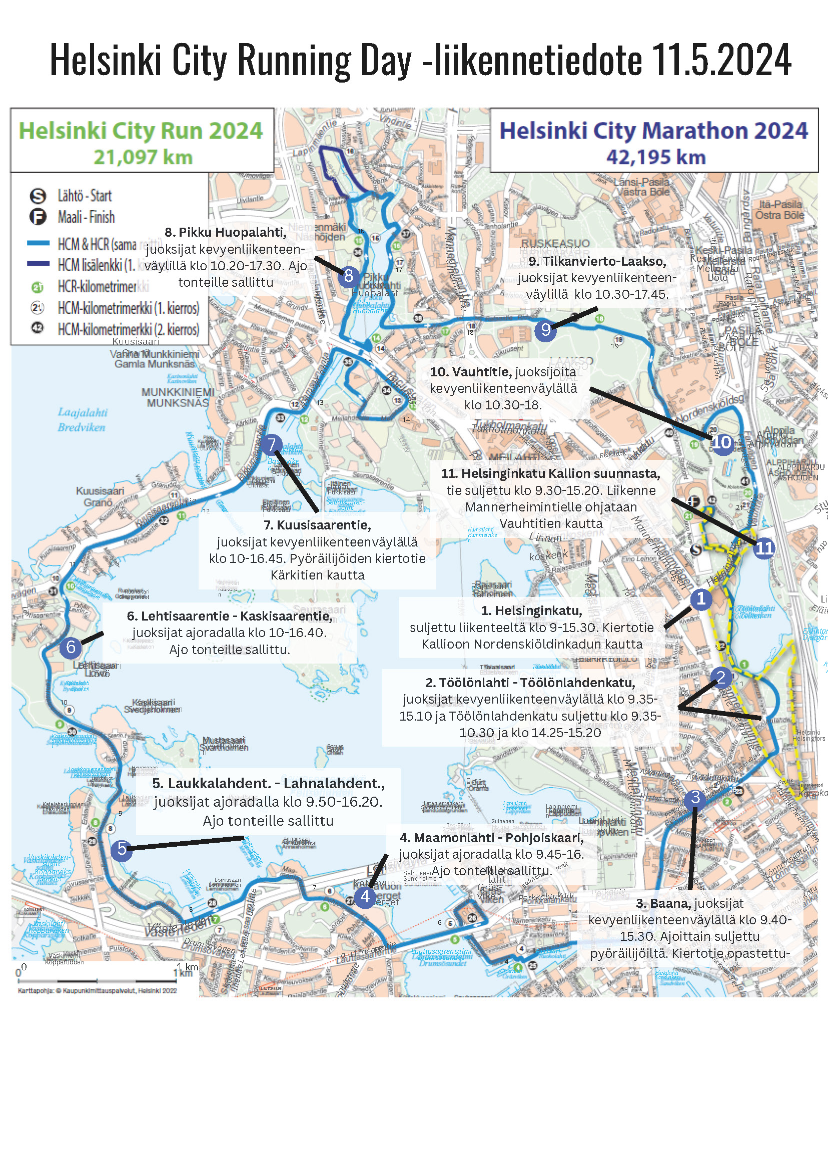 - Töölönlahdenkatu on poikki la klo 9.40–9.50 ja klo 14.25–15.30. Muun ajan tiellä on lyhyitä katkoksia juoksijoiden ylittäessä katua.