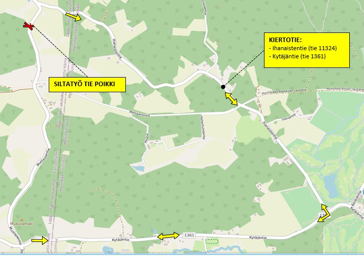 Liikenne ohjataan kiertotielle Kytäjäntien (tie 1361) ja Ihanaistentie (tie 11324) kautta. Kiertotien pituus on noin 10,3 km.