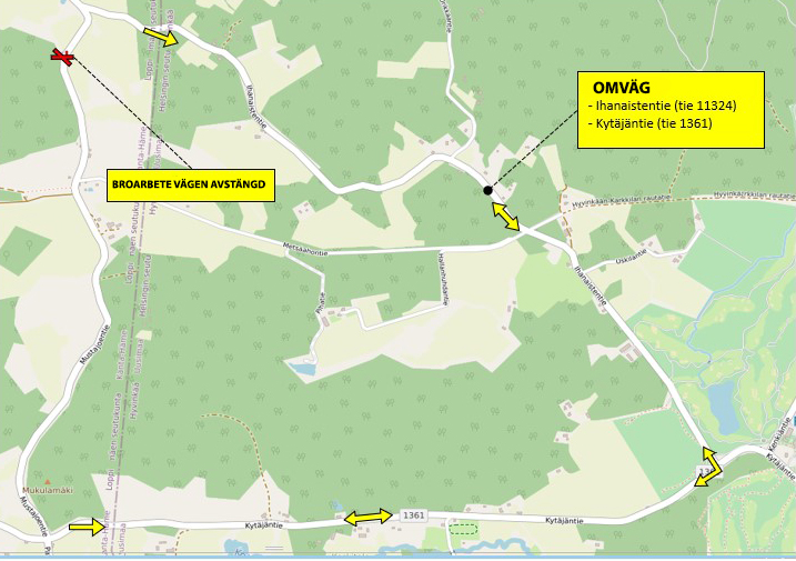 Trafiken dirigeras till en omväg via Kytäjäntien (väg 1361) och Ihanaistentie (väg 11324). Omvägen är cirka 10,3 km lång.