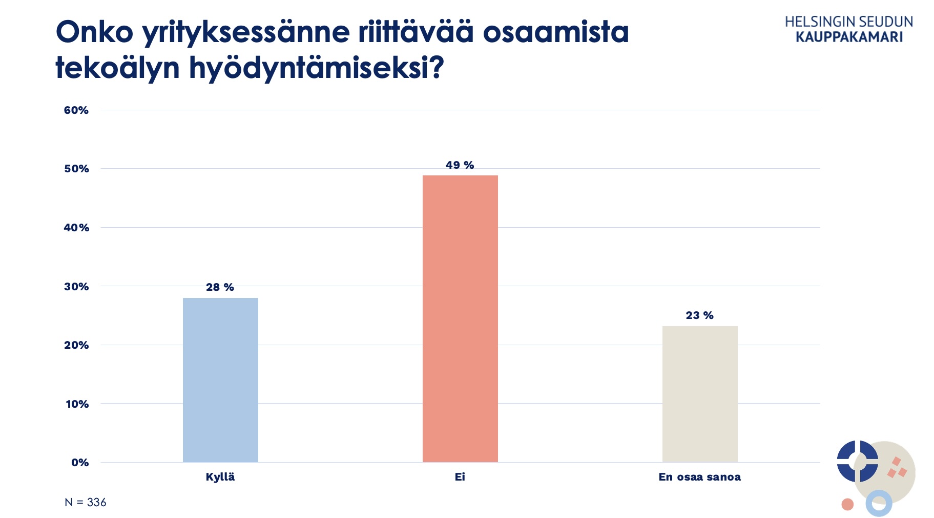 Helsingin seudun yrityksistä 49 prosenttia katsoo, ettei niillä ole riittävää osaamista tekoälyn hyödyntämiseksi, käy ilmi Helsingin seudun jäsenyrityksilleen tekemästä kyselystä. 28 prosenttia katsoo osaamista olevan riittävästi ja 23 prosenttia ei osaa sanoa.