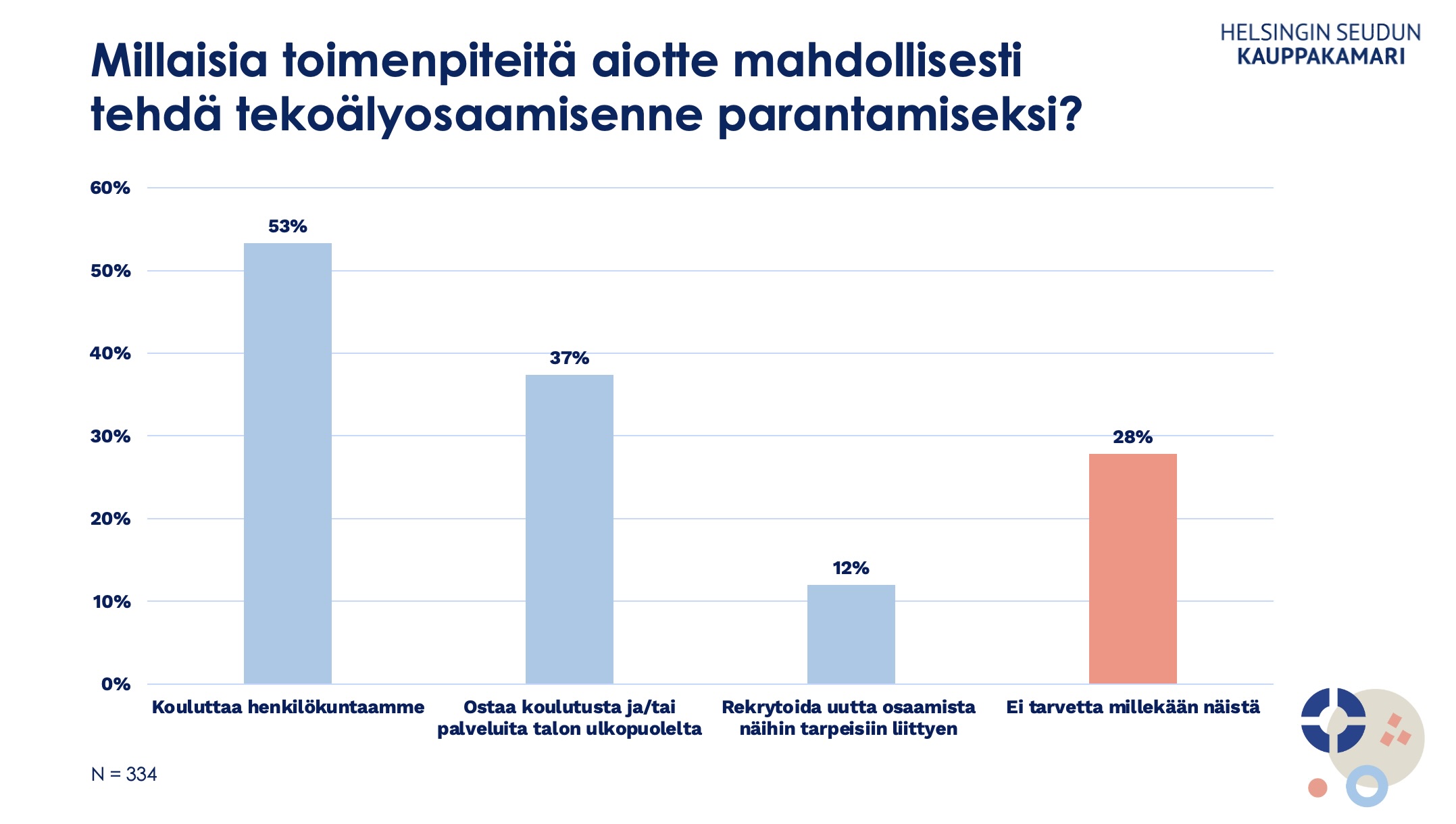Tekoälyosaamisensa kohentamiseksi yritykset Helsingin seudulla aikovat pääasiassa kouluttaa henkilökuntaansa (53 %) ja ostaa koulutusta ja/tai palveluja talon ulkopuolelta (37 %). Vain 12 prosenttia yrityksistä aikoo rekrytoida uutta osaamista tekoälytarpeisiin. 28 prosenttia ei tunne tarvetta millekään edellämainituista.