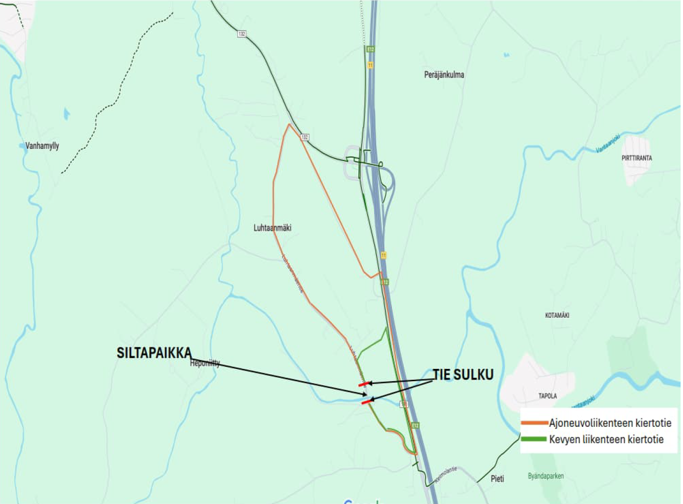 Vantaalla Juholan silta korjataan, liikenne kiertotielle 3.6.–31.7.2024
