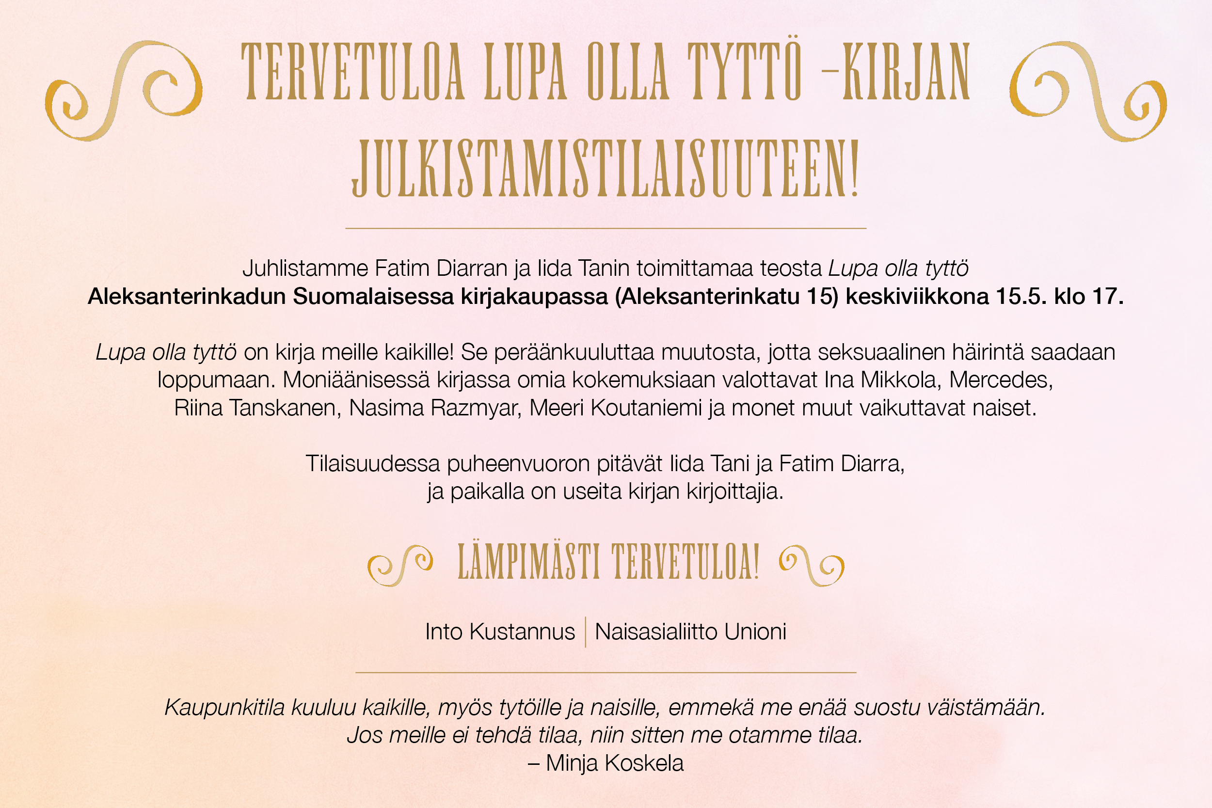 Yhä useampi nuori tyttö kokee elämässään jatkuvasti seksuaalista häirintää. Moni nuori kuitenkin vaikenee kokemastaan häirinnästä, koska aiheeseen liittyy niin paljon pelkoa ja häpeää. Fatim Diarran ja Iida Tanin toimittamassa uutuuskirjassa Lupa olla tyttö Ina Mikkola, Meeri Koutaniemi, Nasima Razmyar, Mercedes, Kirsi Piha ja lukuisat muut tunnetut vaikuttajanaiset tuovat valoon omat kokemuksensa seksuaalisesta häirinnästä ja osoittavat samalla, että häirintä koskettaa meitä kaikkia. Kirjan julkistamistilaisuus Helsingissä 15.5. klo 17.00
