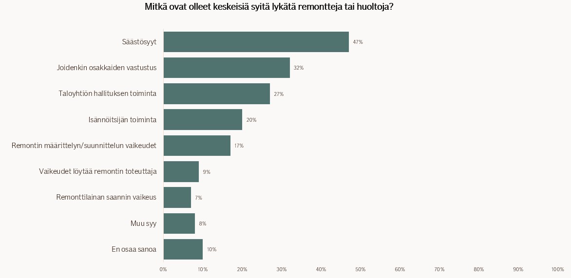 Lähes joka toinen kertoo lykkäysten taustalla olevan säästösyyt. Säästösyyt korostuvat etenkin Uudenmaan ulkopuolella. Seuraavaksi yleisimpiä syitä ovat joidenkin osakkaiden vastustus (32 %) ja taloyhtiön hallituksen toiminta (27 %). Tiedot käyvät ilmi Ifin kyselytutkimuksesta, johon vastasi 1015 suomalaista taloyhtiön osakasta maalis-huhtikuussa 2024.