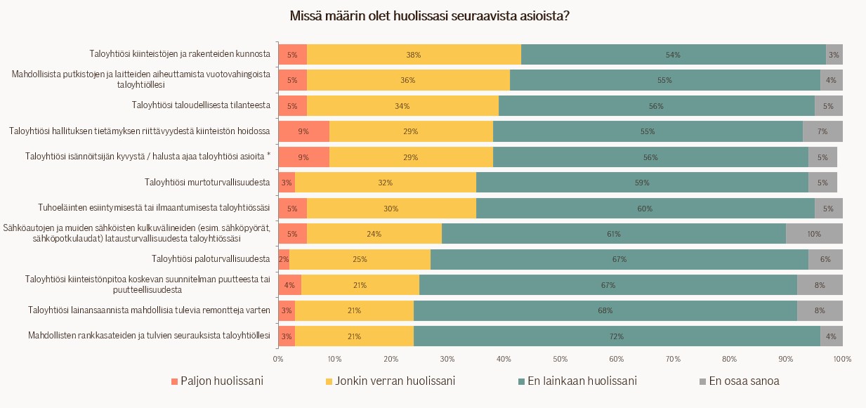 – Useampaa kuin joka kolmatta taloyhtiön osakasta huolettaa kyselyn perusteella se, onko taloyhtiön hallituksella riittävä tietämys kiinteistön hoidosta sekä mikä on isännöitsijän kyky tai halu ajaa taloyhtiön asioita. Taloyhtiön hallitukseen kuuluvat osakkaat ovat näistä huolissaan jopa hieman muita useammin, Rantanen kertoo.