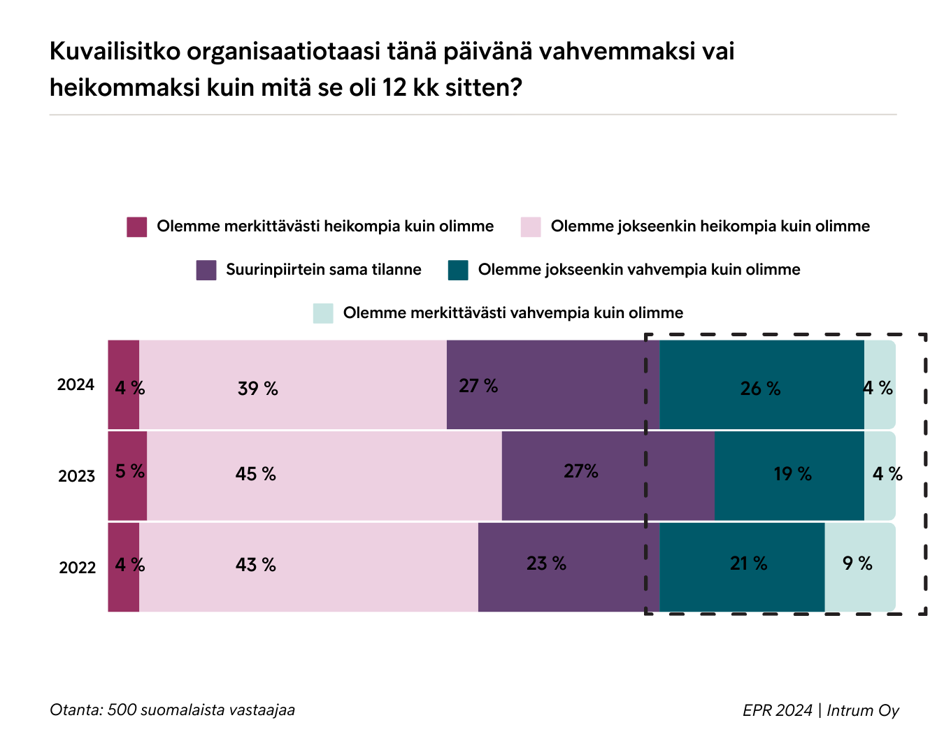 – Tutkimuksemme kertoo, että 30 prosenttia suomalaisyrityksestä kokee olevansa paremmassa taloudellisessa asemassa kuin vuosi sitten. Vaikka suomalaiset yritysjohtajat kokevat useammin, että liikevaihdon kasvu on alle odotetun tason, kasvava määrä suomalaisyrityksistä sanoo, että heidän liiketoimintansa vahvistuu vuosi vuodelta enemmän. Ilahduttavaa on, että yli puolet suomalaisyrityksistä haluaa kasvaa, mutta edelleen korkeat korot ja käytännön haasteet kuten maksujen ja kassavirran hallinta, ovat esteenä, kuvailee Intrumin kaupallinen johtaja Juha Iskala.