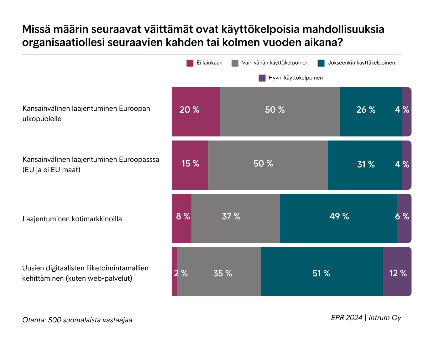 Valtaosa suomalaisista yrityksistä näkee uusien digitaalisten liiketoimintamallien kehittämisen (63 prosenttia) ja laajentumisen kotimarkkinoilla (55 prosenttia) houkuttelevana mahdollisuutena. Sen sijaan kansainväliset laajentumismahdollisuudet Euroopassa (35 prosenttia) nähdään hieman pessimistisemmin kuin muualla Euroopassa. Tähän voivat vaikuttaa maantieteellinen etäisyys ja korkea kustannustaso. Haasteena liiketoiminnan laajentumisessa EU:n ulkopuolelle nähdään erityisesti lakiin ja sääntelyyn liittyvät kysymykset. Suomalaiset yritykset osoittavat myös paineensietokykyä geopoliittisen riskin suhteen, sillä vain 38 prosenttia vastaajista sanoo, että geopoliittinen epävakaus teki heistä varovaisempia laajentumisen suhteen Euroopassa.