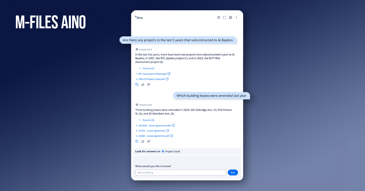 M-Files Aino auttaa M-Filesin asiakkaita hyödyntämään edistyneitä generatiivisen tekoälyn ominaisuuksia ja optimoimaan tietotyöntekijöiden tuottavuutta.