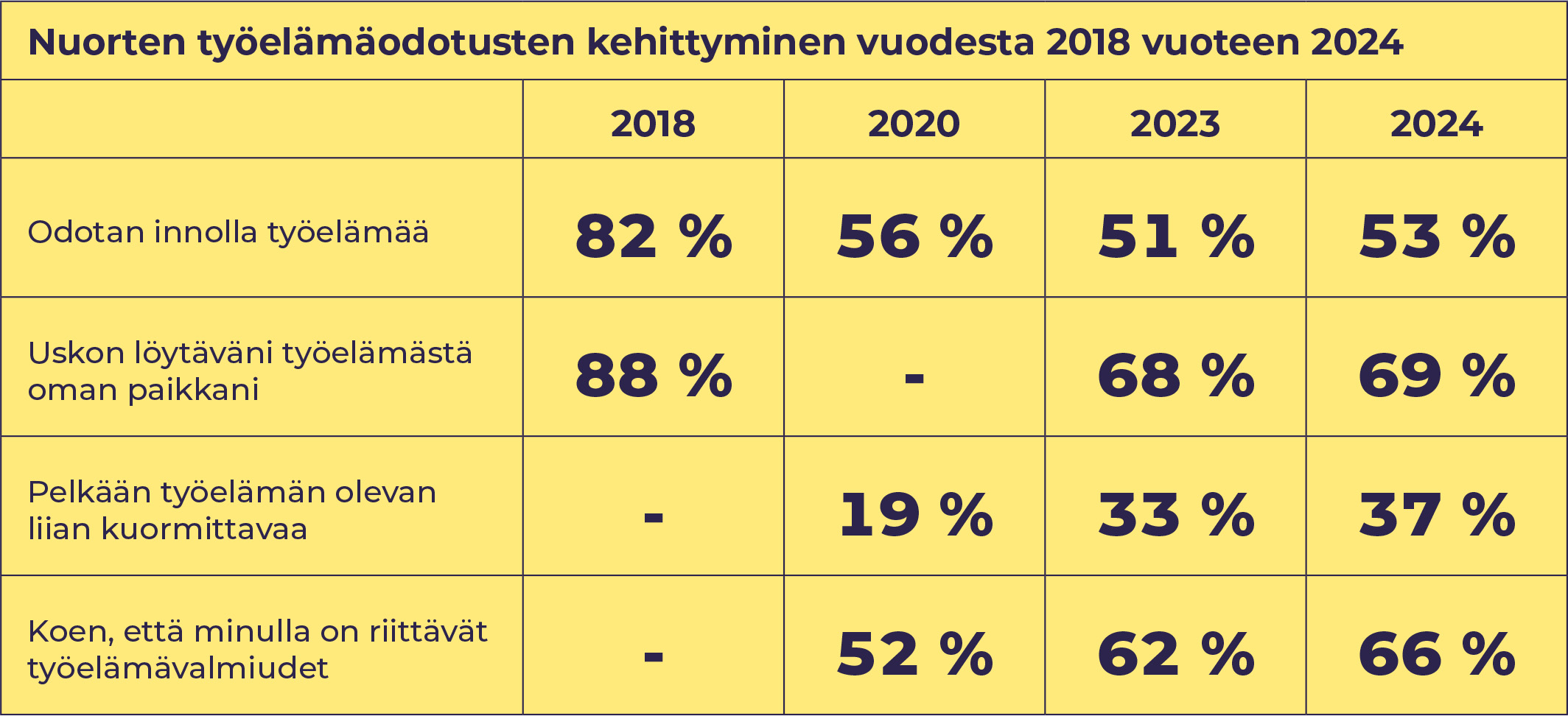 Tulevaisuusraportin mukaan nuorten keskuudessa koetaan enemmän huolta tulevasta työelämästä kuin ennen pandemia-aikaa. Tänä keväänä vain 53 % kertoi odottavansa innolla työelämää, kun vuonna 2018 näin koki 82 % vastaajista. Yläkoululaisista ja 2. asteen opiskelijoista 37 % pelkäsi tulevan työelämän olevan liian raskasta. Myös aiempaa harvempi uskoo löytävänsä oman paikkansa työelämästä (2024: 69 %, 2018: 88 %).