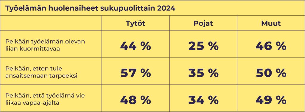 Eniten työelämässä nuoria näyttäisi kuitenkin huolettavan palkan riittävyys. Peräti 47 % kaikista vastaajista oli huolissaan oman toimeentulon riittävyydestä. 43 % puolestaan pelkäsi, että työelämä veisi liikaa aikaa vapaa-ajalta. Huoli työelämästä korostuu erityisesti tyttöjen kohdalla.