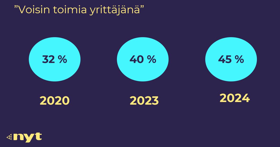 Kyselyn vastauksista käy ilmi kasvava kiinnostus yrittäjyyttä kohtaan. Peräti 45 % vastaajista ilmoitti voivansa toimia yrittäjänä, mikä on viisi prosenttiyksikköä enemmän kuin edellisenä vuotena. Myös aiempaa useampi nuori koki yrittäjyyden yhteiskunnallisen merkityksen tärkeäksi. Esimerkiksi lukiolaisista 83 % koki yritysten yhteiskunnallisen merkityksen tärkeäksi, kun vastaava luku oli vielä vuosi sitten 69 %.