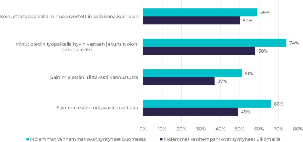 Kehitettävääkin on, sillä vain 49 % koki saaneensa riittävästi kannustusta kesätöissä. Kannustuksen ja arvostuksen puute nousi esille erityisesti maahanmuuttajataustaisten ja sukupuoli muu -ryhmän vastaajista.