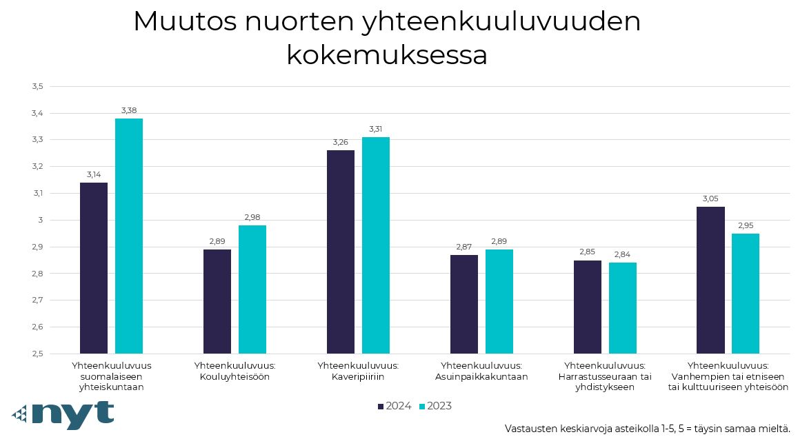 Eriytymiskehitys nuorten keskuudessa näkyy myös yhteenkuuluvuuden kokemuksessa: yhteenkuuluvuuden tunne suomalaiseen yhteiskuntaan ja koulun yhteisöön ovat laskeneet. Sen sijaan yhteyttä koetaan aiempaa enemmän pienempään vanhempien edustamaan yhteisöön.