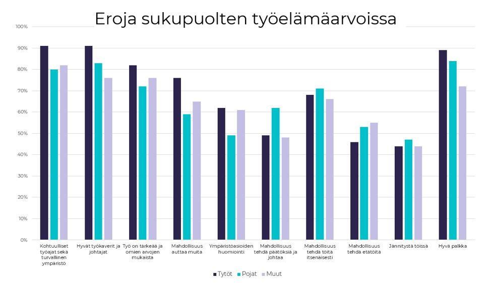 Tulosten perusteella nuorten työelämässä tärkeänä pitämät asiat ovat varsin sukupuolittuneita. Tytöillä vastauksissa korostuvat enemmän yhteisöllisyyteen ja vastuullisuuteen liittyvät teemat (esim. kohtuulliset työajat, mahdollisuus auttaa muita, ympäristöasioiden huomiointi). Pojilla taas korostuvat enemmän esimerkiksi mahdollisuus tehdä päätöksiä ja johtaa, työnteon joustavuus sekä itsenäisyyteen liittyvät työelämäarvot.