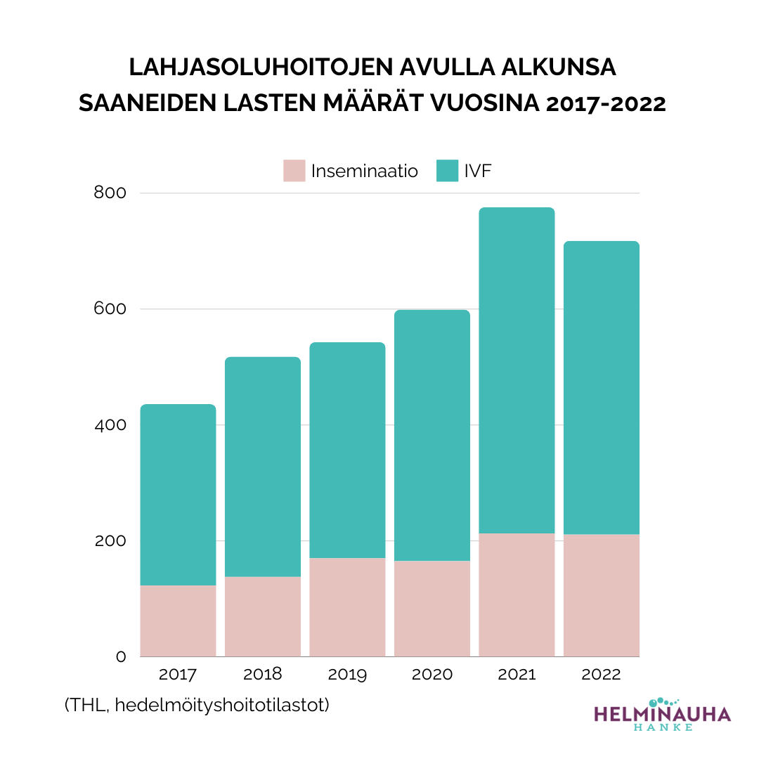 Tuoreen hedelmöityshoitotilaston (THL) mukaan luovutetuilla sukusoluilla toteutettujen hoitojen määrät kasvoivat toista vuotta. Kehysriihen leikkausten vuoksi lahjasoluhoidoilla lapsen saaneille perheille tietoa ja tukea tarjoavan Helminauha-hankkeen toiminta joudutaan lopettamaan.