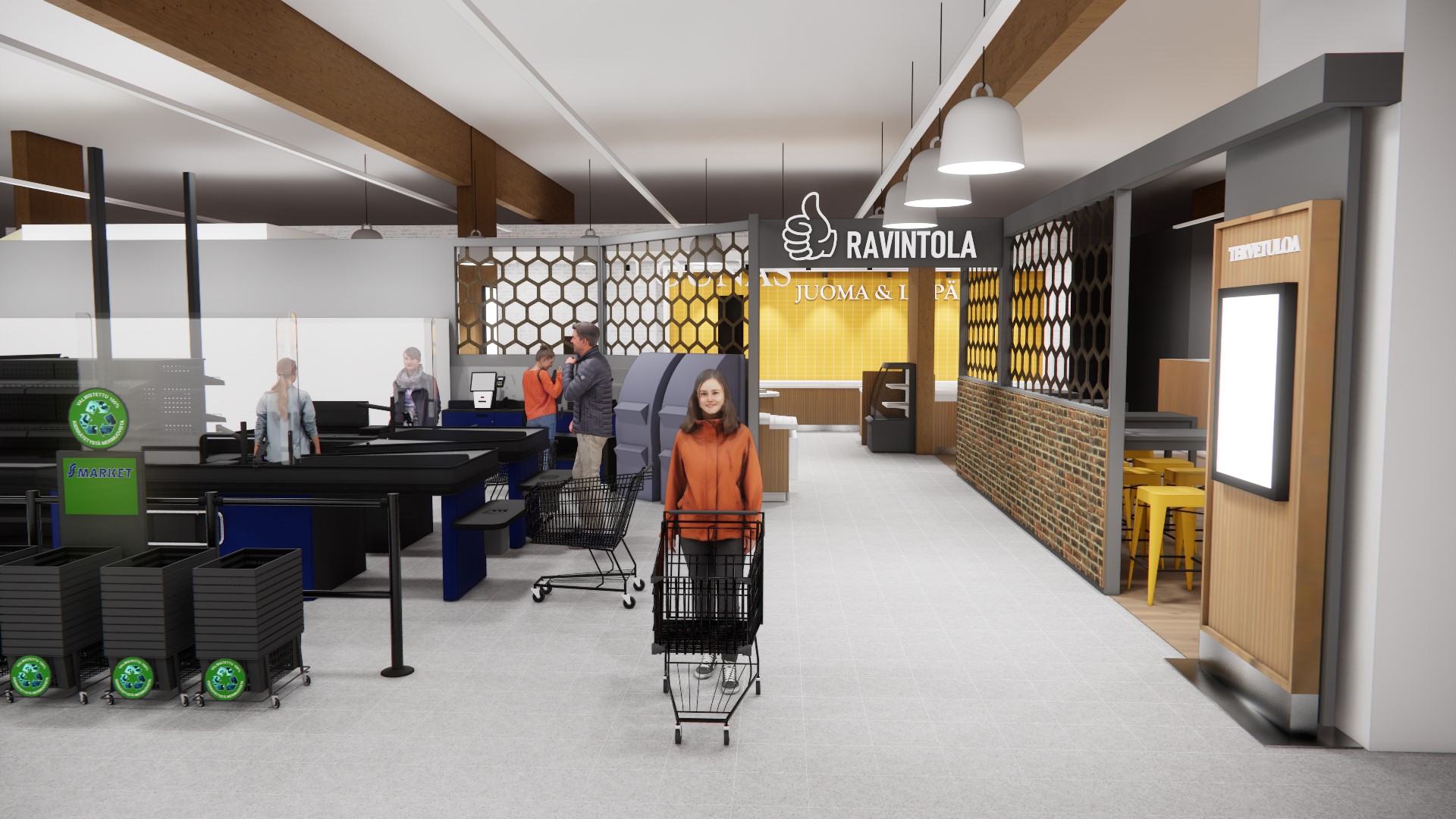 Havainnekuva uudistetusta S-Marketin sisätilasta, jossa asiakas työntää ostoskärryä ja taustalla näkyy ravintola-alue.